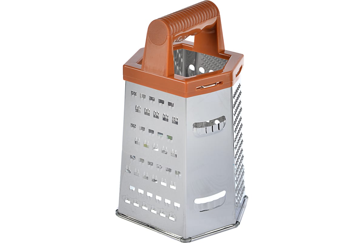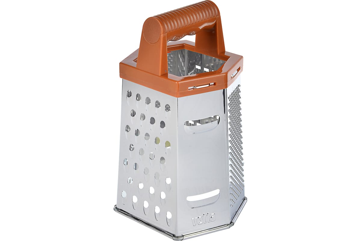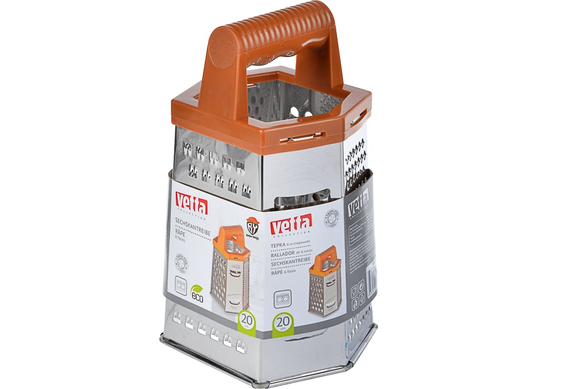 Терка VETTA KL326A-8S 6-ти сторонняя, 20 см, нержавеющая сталь, под дерево 885-072 измельчает любые продукты от твердого сыра и цедры лимона до вареных овощей для слоеных салатов.