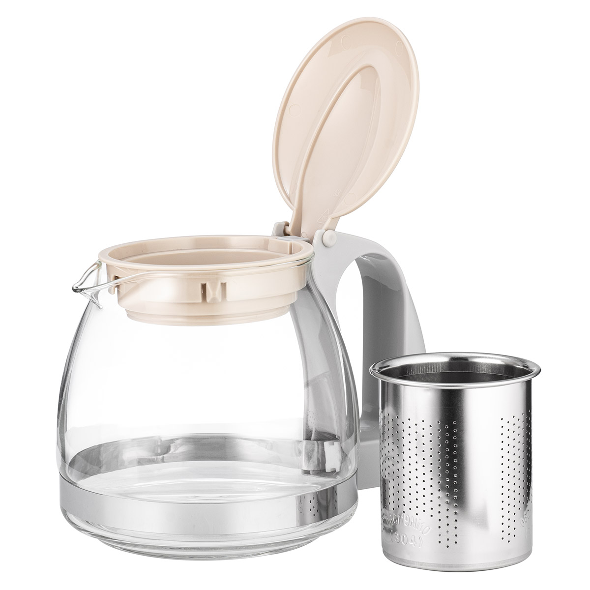 Чайник для заваривания LARA – отличное решение для приятного чаепития. Объема чаши хватит, чтобы заварить 2-3 порции любимого напитка. Эргономичная ручка и крышка с курком дают возможность использовать его одной рукой. При производстве были использованы только экологически чистые материалы. Чайник классической формы выполнен из прозрачного силикатного стекла, стильная крышка и ручка – из пищевого пластика. Кольцо из нержавеющей стали с хромированной отделкой крепит ручку к колбе и дополняет внешний вид