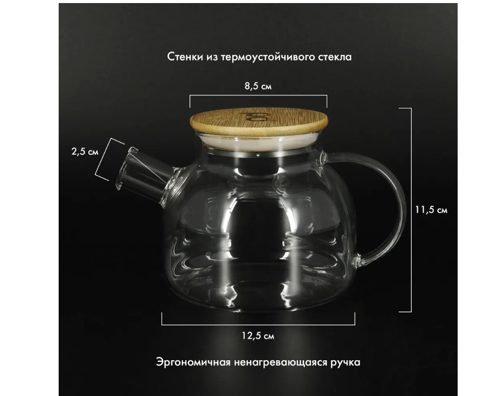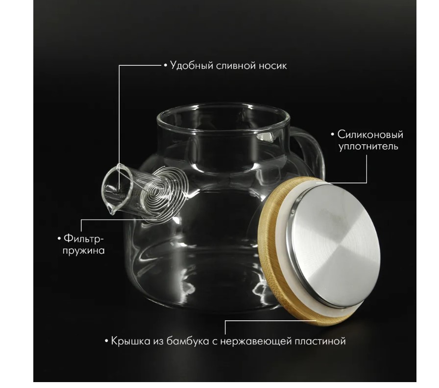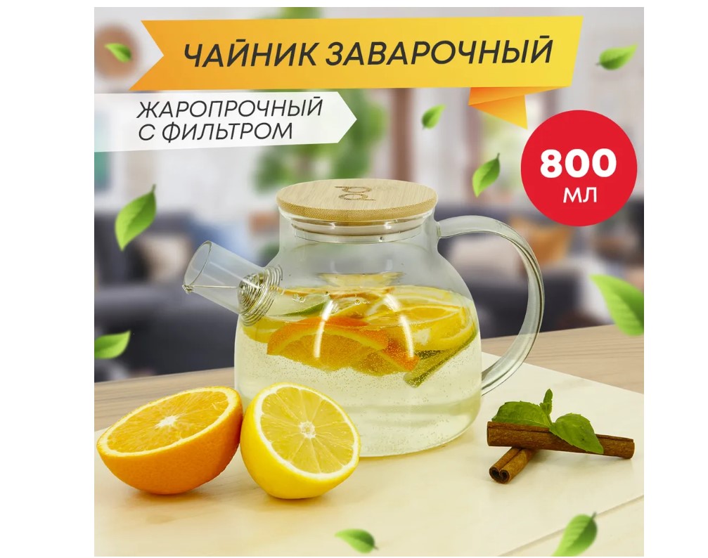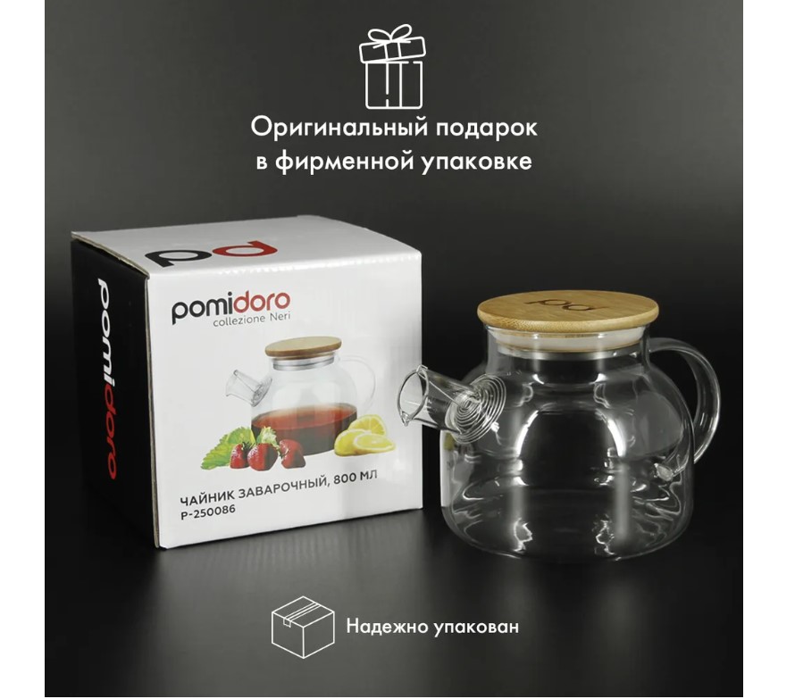 Чайник заварочный стеклянный Pomi d'Oro Neri с фильтром-пружиной и бамбуковой крышкой, 800мл. Отлично впишется в кухню любого дизайна и стиля. Чайник выполнен из жаропрочного слекла, что позволяет использовать его на электрических и газовых плитах. Носик "антикапля" позволяет разлить напиток без проливания. Бамбуковая крышка с силиконовым уплотнительным кольцом не упадет при наливании напитка в чашку. Фильтр-пружина выполнен из высококачественной нержавеющей стали, что сделает ваше чаепитие абсолютно безопасным и защитит ваш напиток от попадания в него чаинок. В чайнике можно заваривать как листовые чаи, так и фруктовые.