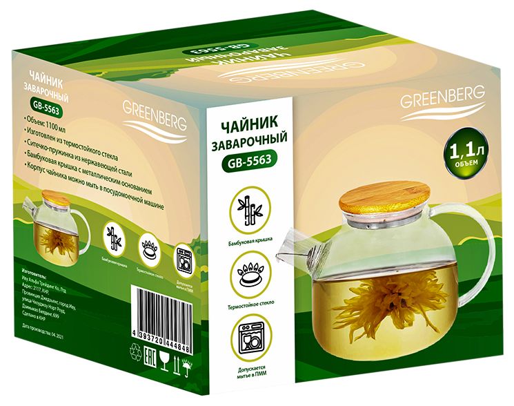 Чайник заварочный 1100 мл Изготовлен из термостойкого стекла Ситечко-пружинка из нержавеющей стали Бамбуковая крышка с металлическим основанием Корпус чайника можно мыть в посудомоечной машине