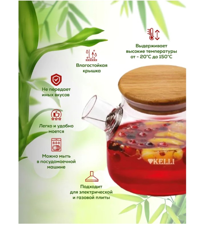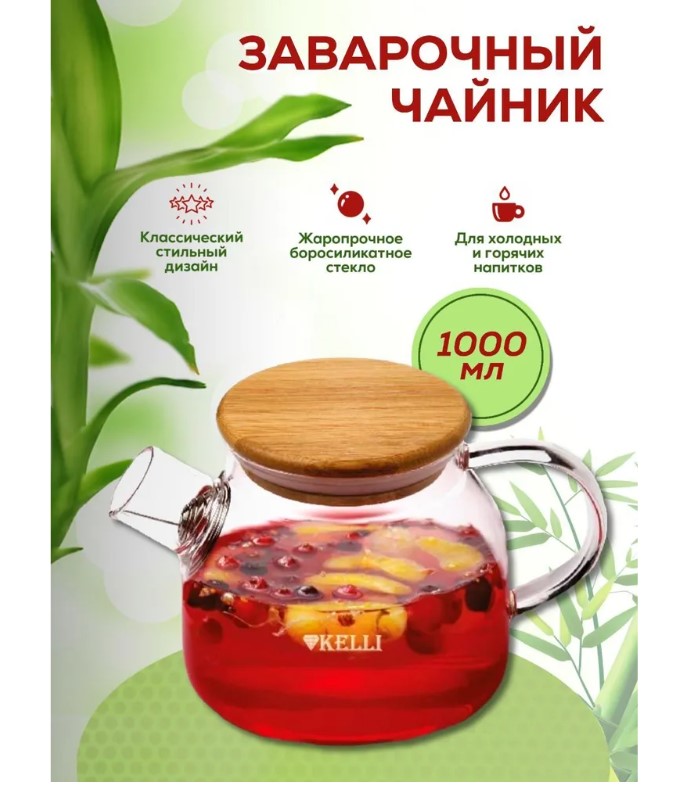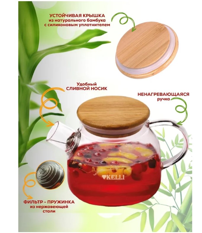 Заварочный чайник Kelli KL-3226 в форме "Бочонка" объемом 1000 мл изготовлен из жаропрочного боросиликатного стекла. Носик позволяет разлить напиток без проливания. Встроенный в носик фильтр-пружинка из нержавеющей стали задерживает чаинки и кусочки фруктов в чайнике. Бамбуковая крышка делает чайник невероятно стильным и практичным, и при этом она имеет силиконовый уплотнитель и снизу облицована пластиной из пищевой нержавеющей стали. А это значит, что крышка долговечна, не упадет при наливании напитка и убережет руки от ожогов. В заварочном чайнике можно приготовить любой напиток, насладиться вкусом и ароматом чая. Прозрачный корпус позволит наблюдать за магическим процессом раскрытия чайного листа, цветов и фруктов. Этот чайник станет прекрасным подарком, и создаст уютную атмосферу чаепития в кругу семьи и друзей.