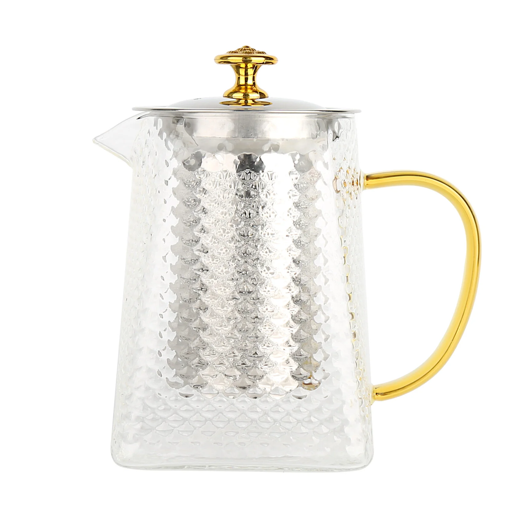 Заварочный чайник со съёмным металлическим фильтром/ситечком изготовлен из толстого рельефного термостойкого боросиликатного стекла, которое обладает повышенной термической стойкостью, поэтому может применяться как на электрической, так и на газовой плите. Устойчив к перепадам температуры, царапинам и помутнениям. Чайник оснащен удобной ручкой золотого цвета , которая не нагревается при подаче горячих напитков.