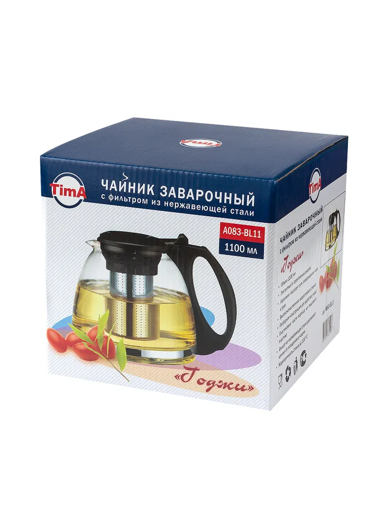 Стеклянный заварочный чайник ТимА из серии ГОДЖИ 1100 мл из жаропрочного стекла отлично подойдет для кухни, офиса или дачи, изделие поставляется в подарочной упаковке. Большой стеклянный чайник для заварки предназначен для чая, травяных настоев, ягод, фруктов, воды и др.