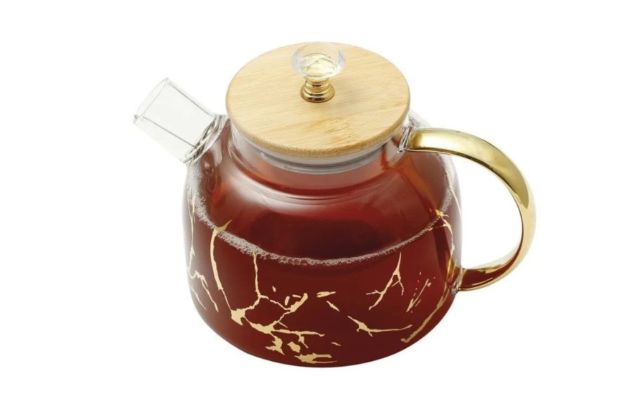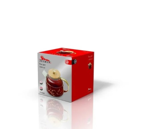 Чайник заварочный ZEIDAN , корпус из термостойкого боросиликатного стекла с декором "под золото", ручка на корпусе с декоративным покрытием "под золото", крышка - бамбук с декоративной ручкой "кристалл". Возможность использования на плите, съемный фильтр-пружина из высококачественной нержавеющей стали, подарочная упаковка.