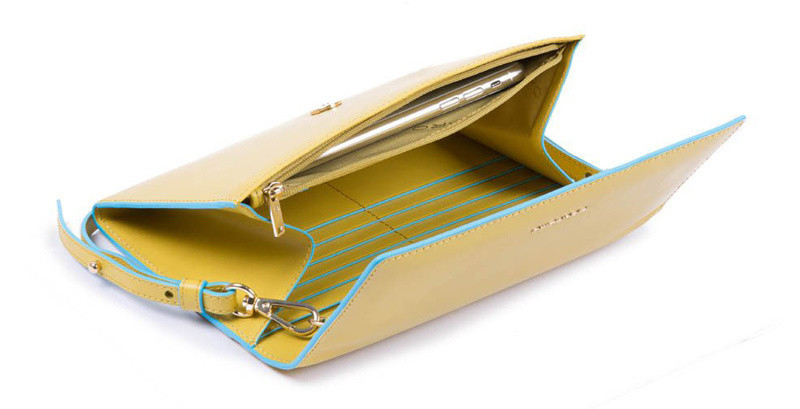 Описание: Женский клатч со съемным плечевым ремнем из коллекции Piquadro Blue Square. Изготовлен из гладкой телячьей кожи с фирменным голубым кантом. Клатч имеет одно отделение с кармашками для телефона и 10 банковских карт.