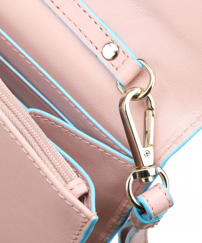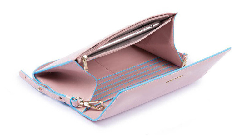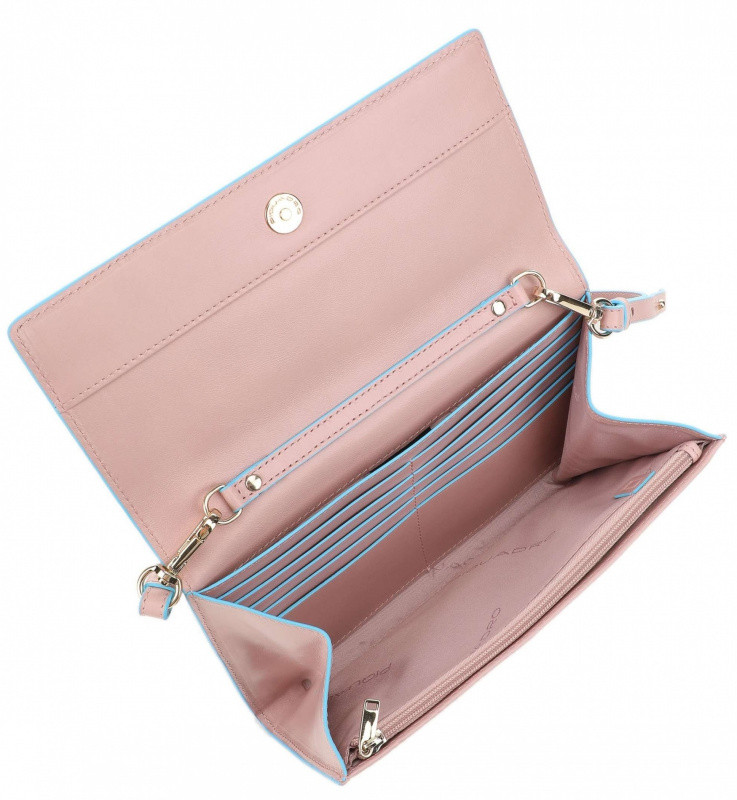 Описание: Женский клатч со съемным плечевым ремнем из коллекции Piquadro Blue Square. Изготовлен из гладкой телячьей кожи с фирменным голубым кантом. Клатч имеет одно отделение с кармашками для телефона и 10 банковских карт.