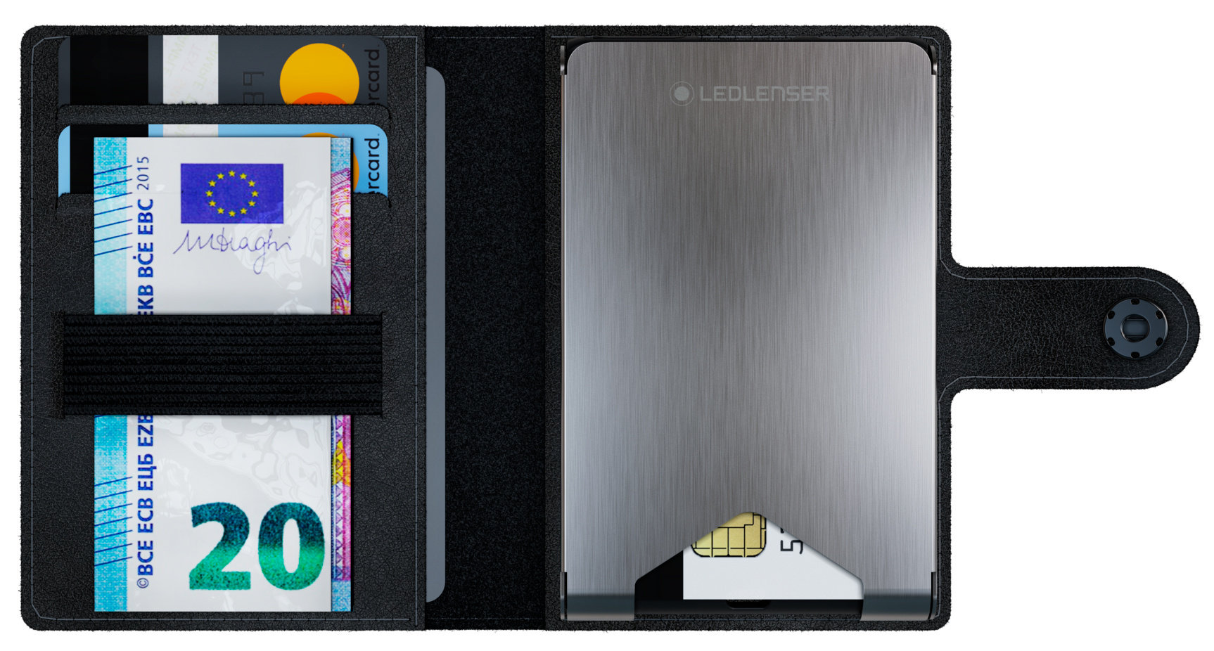 Внутрь кошелька поместятся несколько пластиковых карт. Сможете расположить их с обоих сторон: в специальные кармашки и под металлический корпус фонаря.