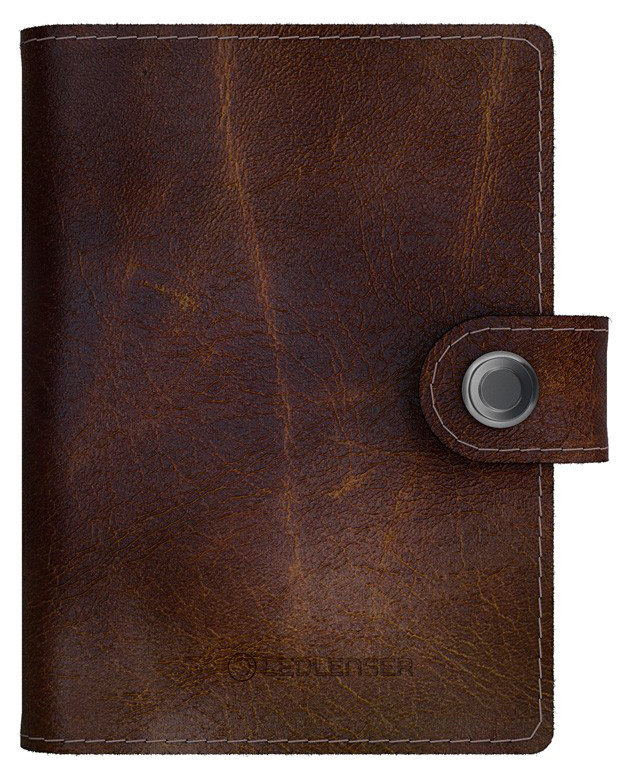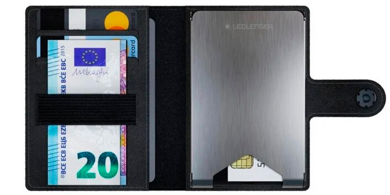 Инновационный кошелек – фонарь с технологией защиты персональных данных RFID (радиочастотная идентификация). Кошелек из натуральной кожи, на кнопке, c 2 отсеками для кредиток, ремешком для банкнот, а также с металлическим крепежом для 6 карт с защитой RFID.
