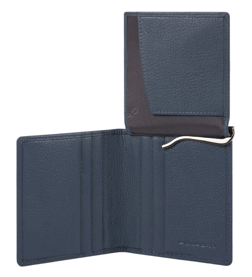 Портмоне из натуральной кожи черного цвета с контрастным голубым кантом и фирменным тиснением с логотипом бренда. Имеется шесть отделений для карт, карман для документов, зажим для купюр.