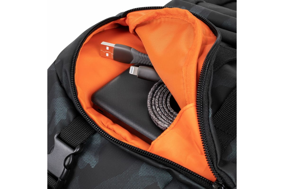 Два внешних передних кармана создают место для хранения аксессуаров, визитных карт, смартфона. Имеется съёмный карабин для ключей и скрытый карман на молнии для паспорта, бумажника.