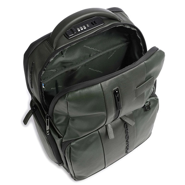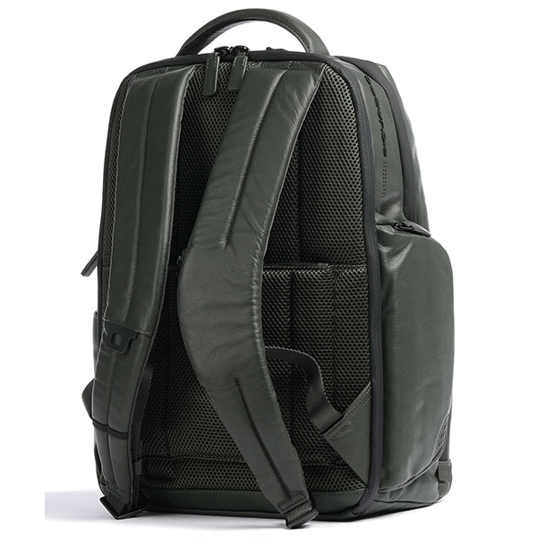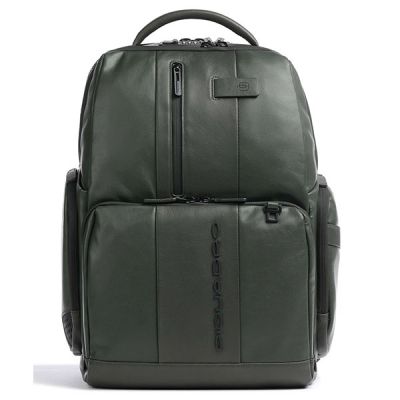 Рюкзак изготовлен из мягкой структурной телячьей кожи, фурнитура черненая, матовая. Имеет одно основное отделение с отсеком для 14 дюймового ноутбука и планшета. На передней части рюкзака расположен карман на молнии с отсеками для телефона и письменных принадлежностей. По бокам расположены карманы на молнии для бутылки и зонта, на задней части рюкзака предусмотрена планка для ручки чемодана. Рюкзак имеет небольшой вес, всего 896 грамм и оптимальные габариты, благодаря чему он идеально подходит для ежедневного использования, как для работы, так и для повседневных нужд.