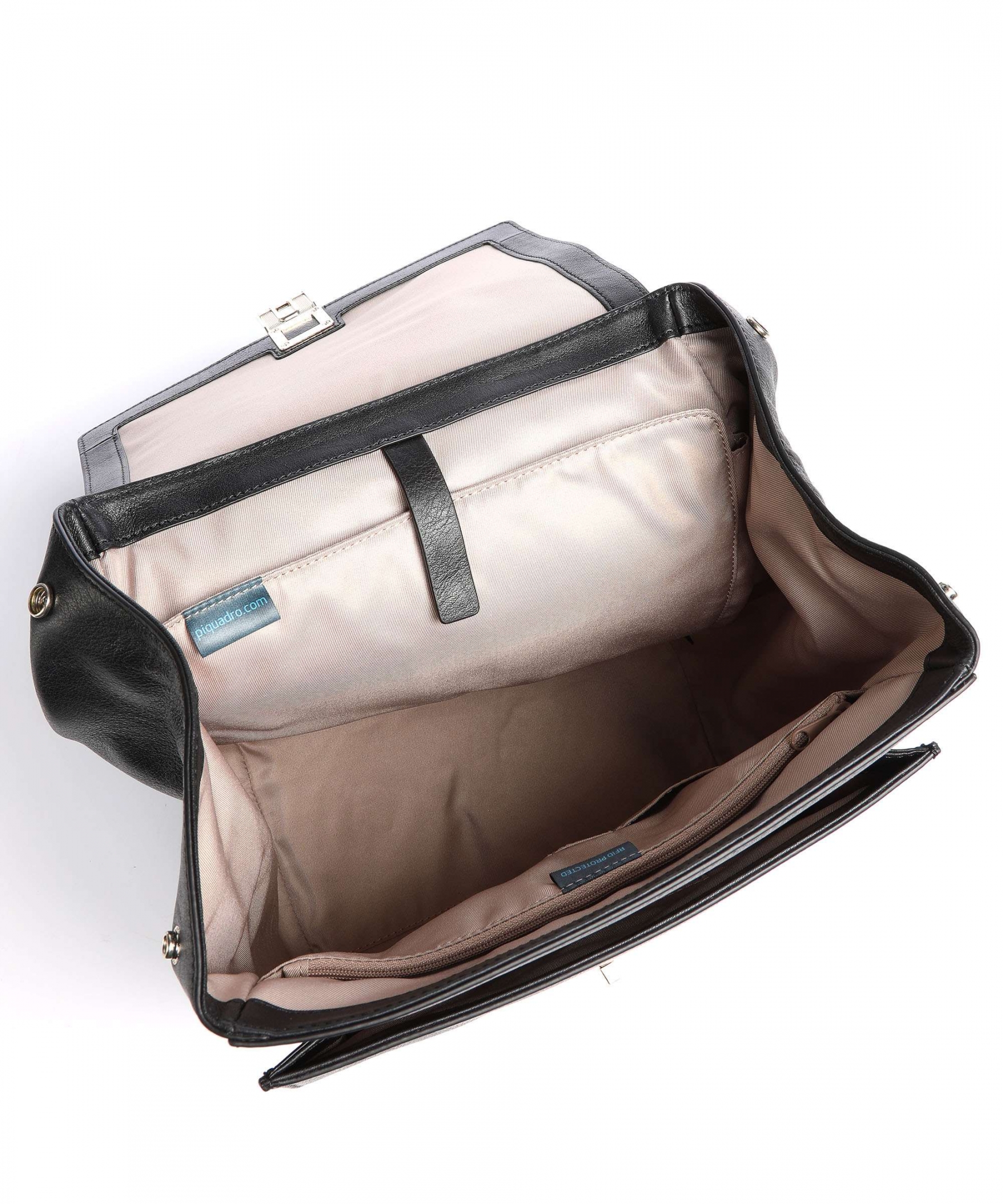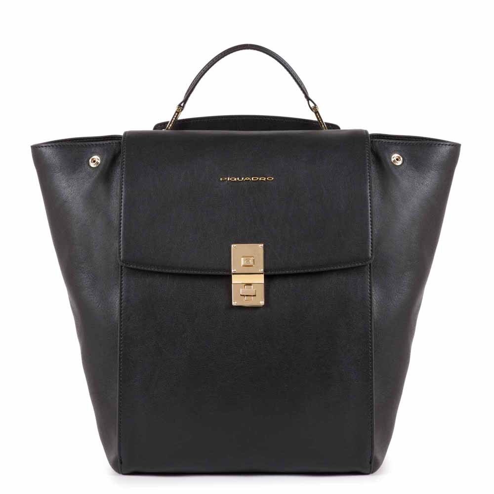 Женский кожаный рюкзак из коллекции Piquadro Dafne. Изготовлен из мягкой премиальной телячьей кожи с использованием металлической отделки светло-золотистого цвета. Рюкзак имеет одно отделение с отсеком для 13,3 дюймового ноутбука, кармашками для телефона и письменных принадлежностей, а также планку на задней стенке для крепления на ручку дорожного чемодана. Верхняя часть имеет кнопки, позволяющие изменять форму рюкзака.