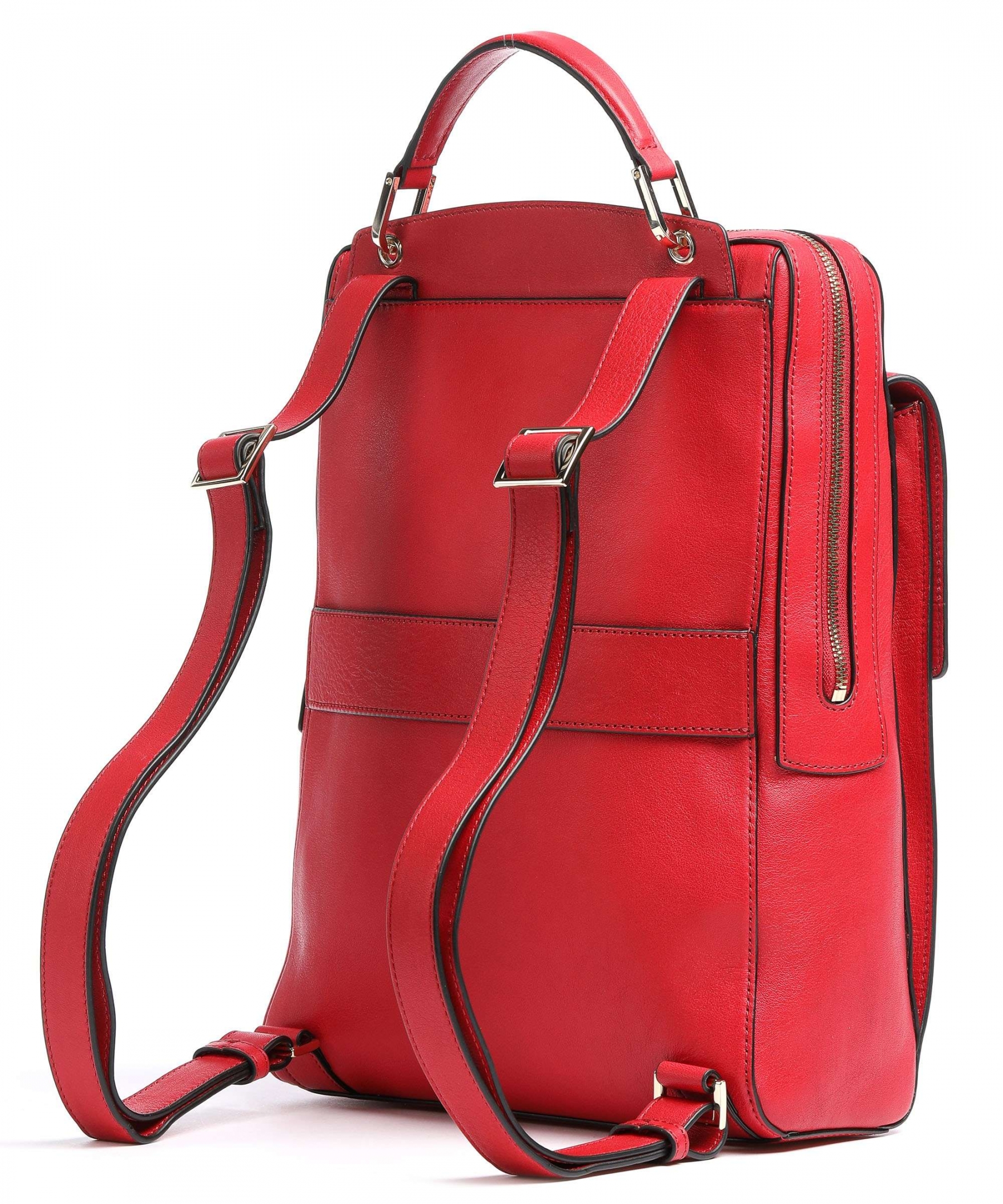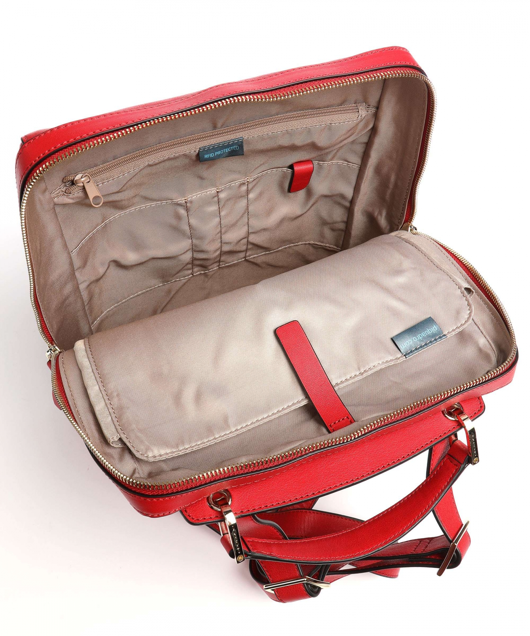 Женский кожаный рюкзак из коллекции Piquadro Dafne. Изготовлен из мягкой премиальной телячьей кожи с использованием металлической отделки светло-золотистого цвета. Рюкзак имеет одно отделение на молнии с отсеком для 13,3 дюймового ноутбука, кармашками для телефона и письменных принадлежностей, а также большой внешний карман и планку на задней стенке для крепления на ручку дорожного чемодана.
