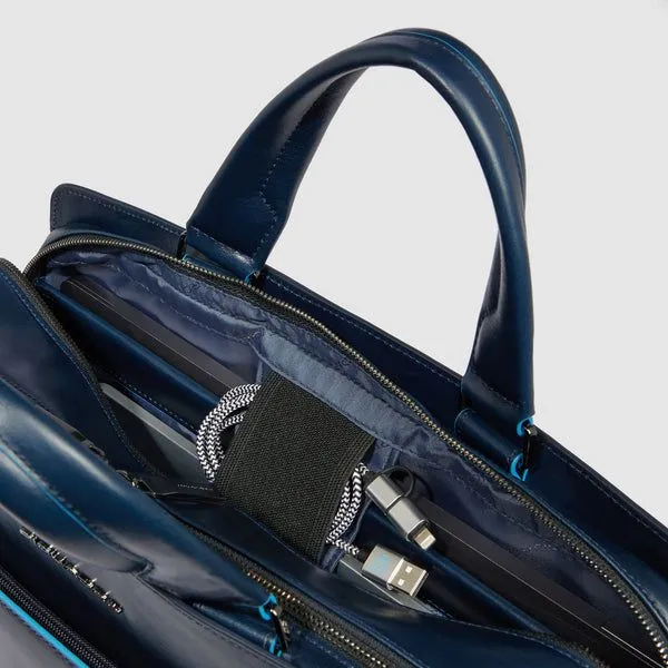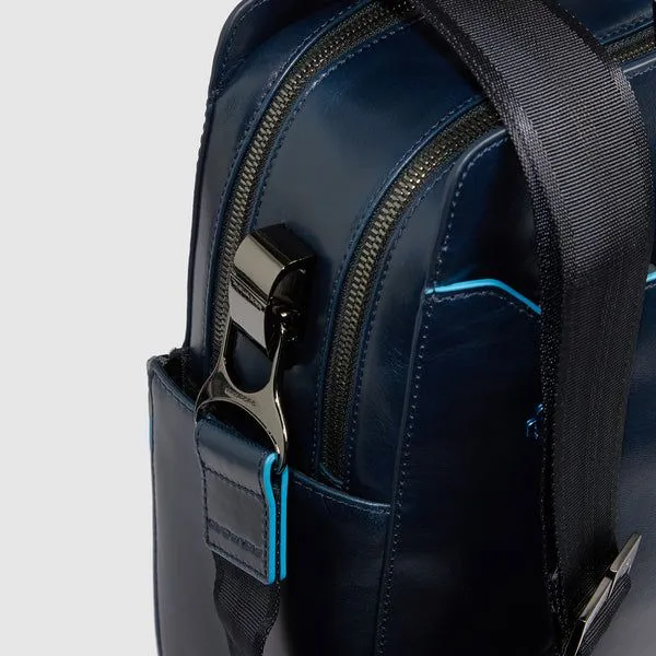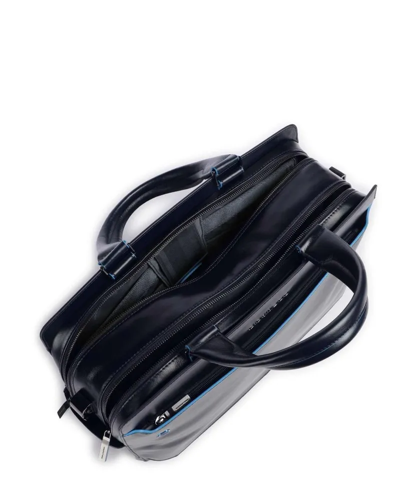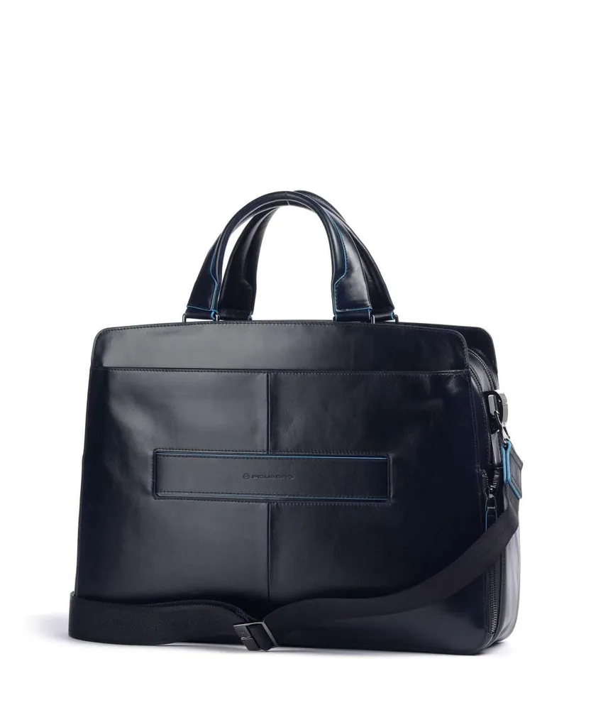 Кожаная мужская сумка с двумя отделениями из коллекции Piquadro Blue Square. Сумка изготовлена из премиальной гладкой телячьей кожи с фирменным голубым кантом. В одном отделении расположен защитный отсек для 15.6 дюймового ноутбука и планшета. В другом, карман на молнии и органайзер для телефона и письменных принадлежностей. Плечевой ремень в комплекте. Поставляется в пыльнике и транспортировочной коробке. Новинка.