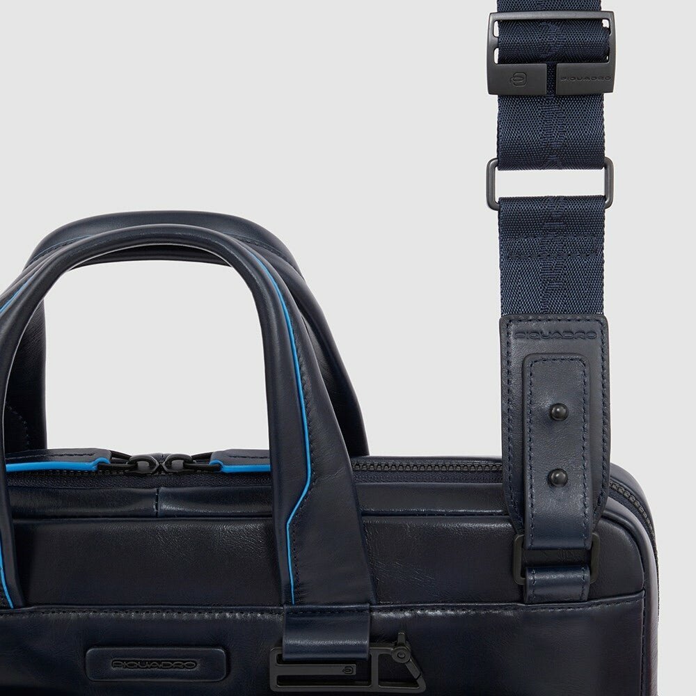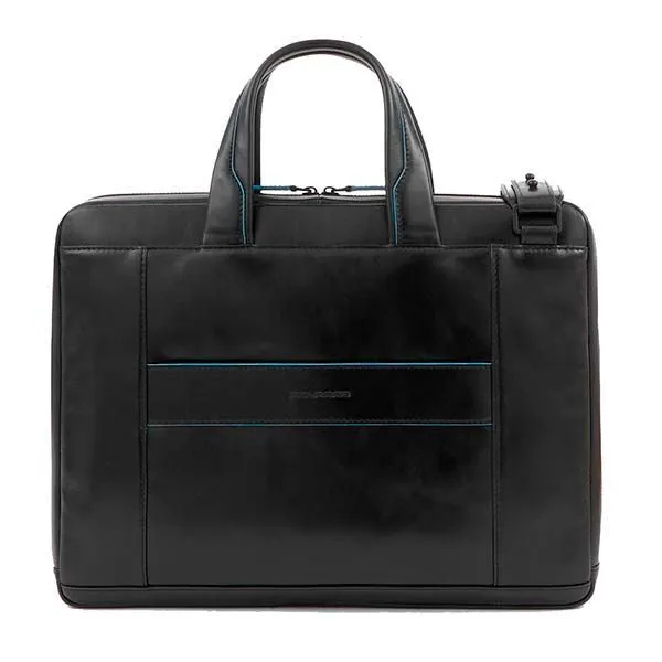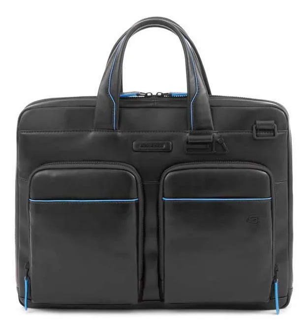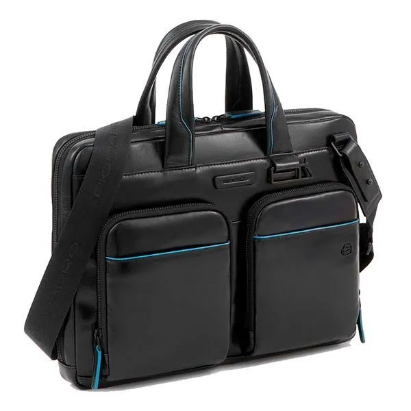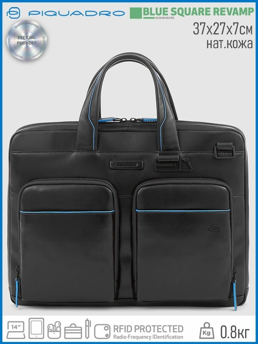 Стильная мужская сумка из гладкой натуральной телячьей кожи с голубым кантом и черной фурнитурой. Коллекция Blue Square Revamp (B2S). Сумка имеет одно отделение с отсеком для 14 дюймового ноутбука и планшета, кармашками для телефона, ручек, наушников, а также большой внутренний карман на молнии. На задней части сумки находится крепление на чемоданную ручку и скрытый карман. Это новая модель 2023 года, в удобном размере и небольшом весе, оптимальный вариант на каждый день!