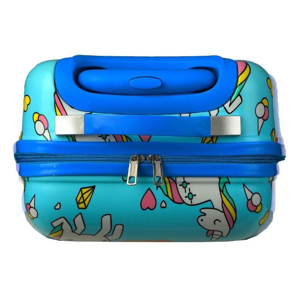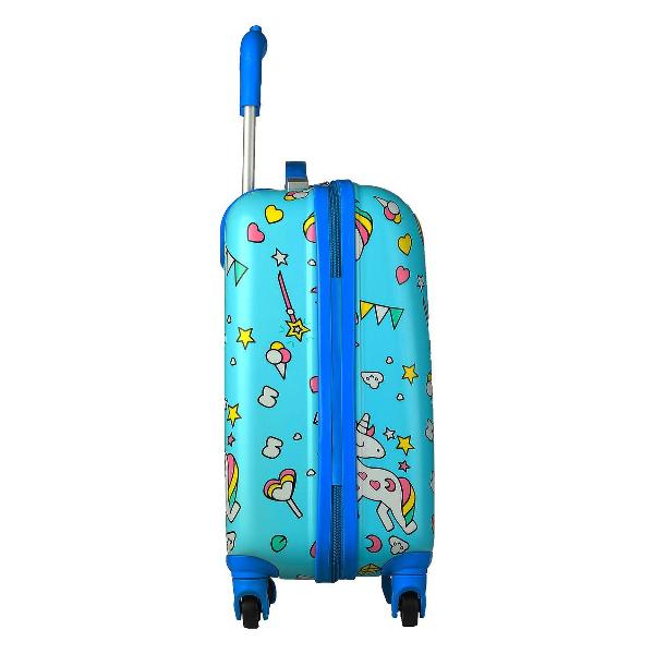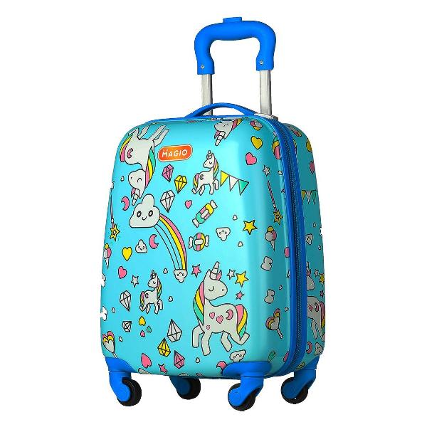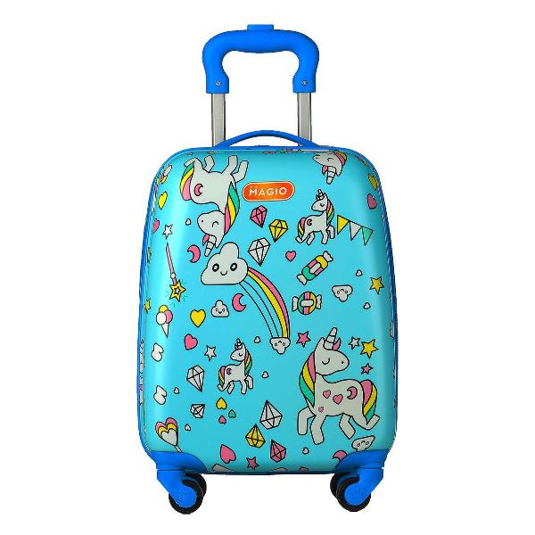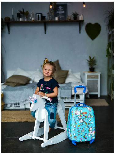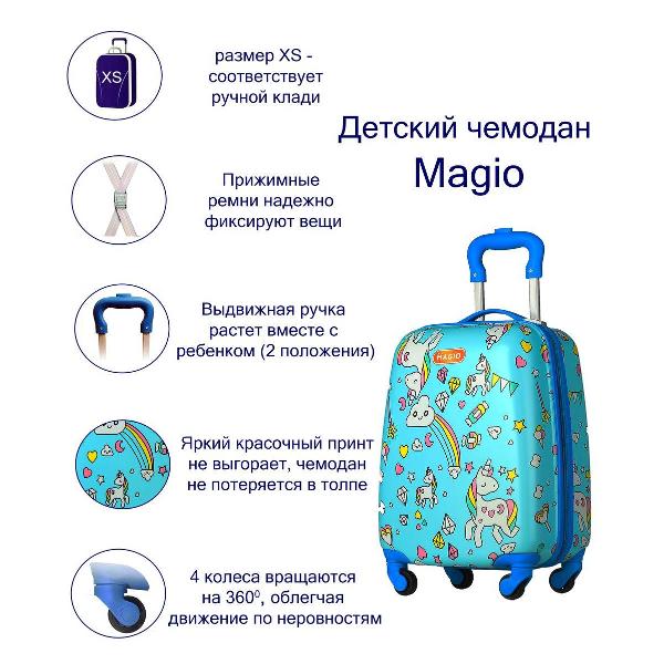 Крепкая молния не заедает во время расстегивания. Внутри основного вместительного отделения есть дополнительный карман для небольших предметов и специальные стяжные ремни для надежной фиксации вещей. Полезный объем чемодана MAGIO «Милые единороги», разноцветный (163) с жестким каркасом составляет 28 л. Детская модель оптимальна для перевозки багажа при передвижении на поезде, самолете, автомобиле.