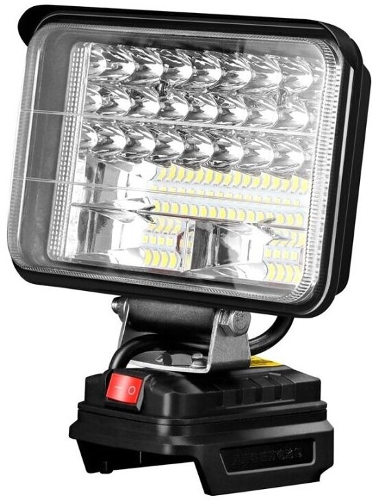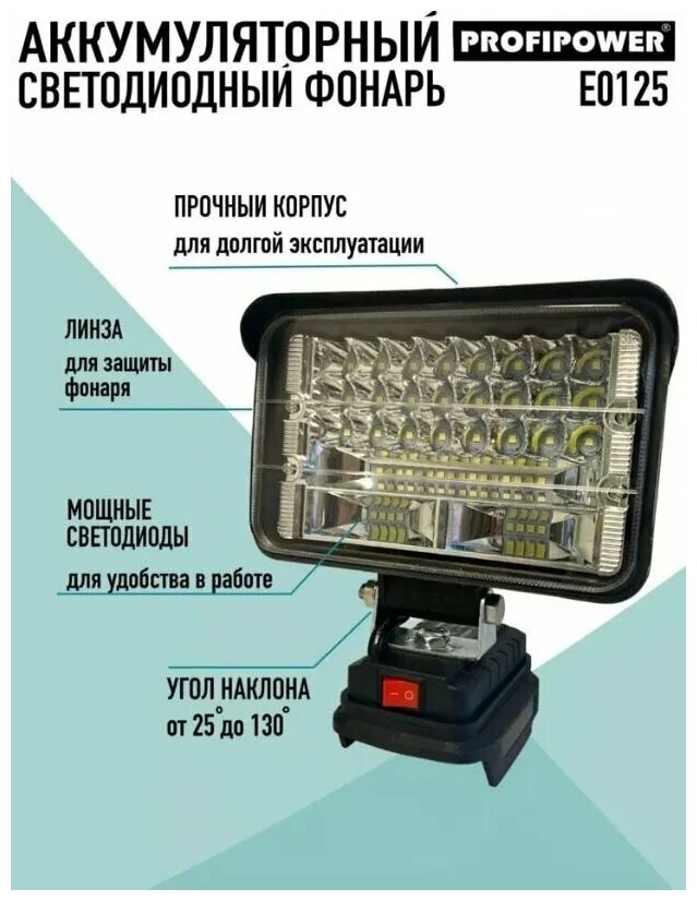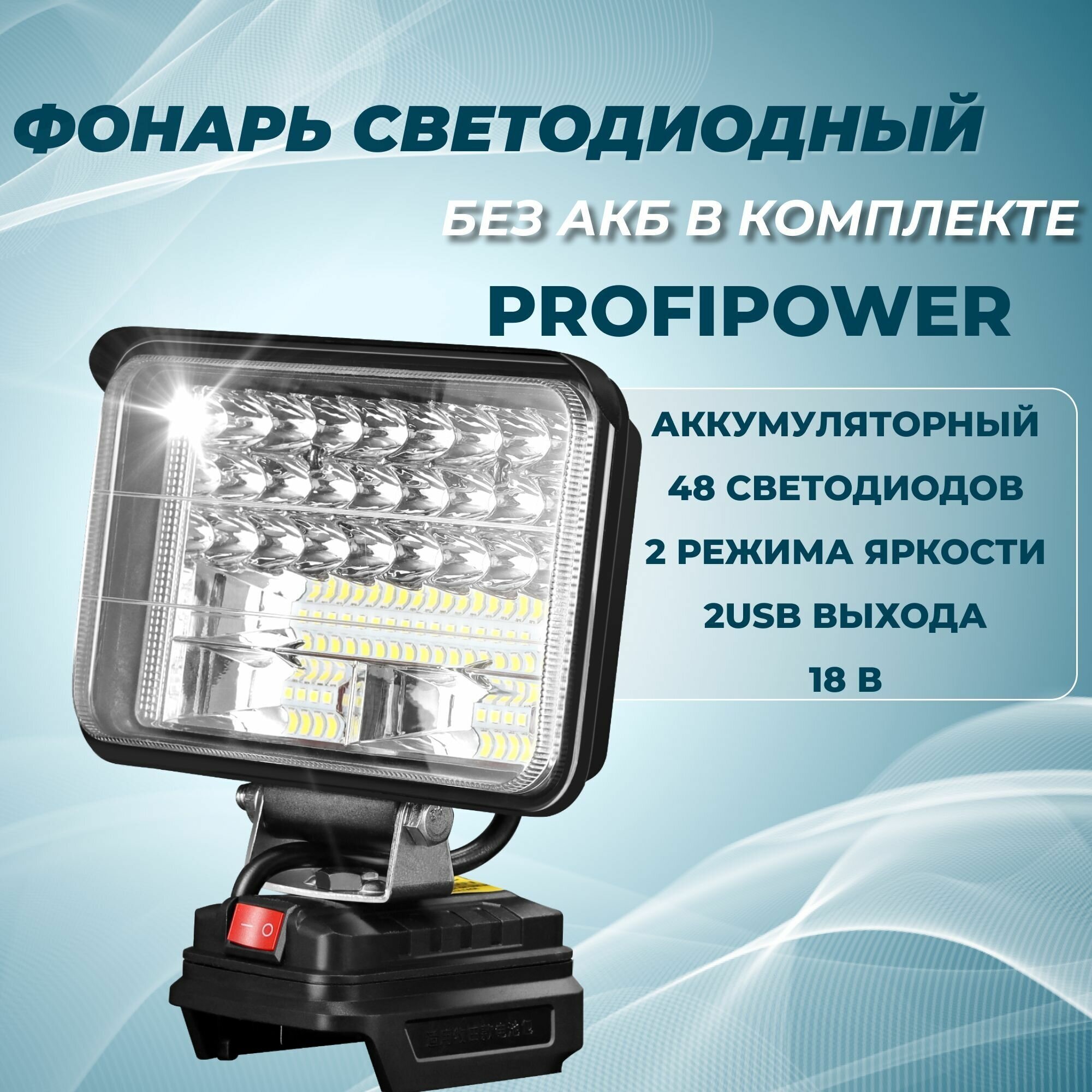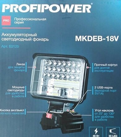 Фонарик MKDEB-18V 48Вт – электроинструмент, который необходим для освещения рабочей зоны внутри помещения или на улице. Также может использоваться в качестве аварийного освещения для подготовки к чрезвычайным ситуациям. Идеально подойдет для мастеров, которые работают в темное время суток на объекте, возле дома, или для мужчин, которые занимаются хозяйственными работами на даче или в саду. Уличный фонарь имеет небольшой вес и удобно лежит в руке. Многогранный рефлектор контролирует направление и яркость света для того чтобы обеспечить четкое круглое пятно света с равномерной высокой яркостью. Голова поворотного механизма (от -25° до +130°) позволяют максимально точно направить свет и значительно повышают удобство эксплуатации. Имеет прочный корпус и 2 USB-порта (5В/1А) для питания внешних устройств. Работает от аккумуляторов с напряжением 18 В. Максимальное время работы составляет 4 часа. Дальность освещения - 15 м. Устройство совместимо с аккумуляторами MAKITA, PROFIPOWER. Переносной диодный фонарь будет отличным подарком любимому мужу или папе на день рождения. Подумайте о приятном презенте для парня, если он любит работать и проводить время на дачном участке. Тот, кто занимается строительством или ремонтом обязательно оценят такой аккумуляторный инструмент. Фонарь светодиодный аккумуляторный ProfiPower MKDEB-18V (без аккумулятора, подходит артикул X0005, X0004 и для литиевой батареи Makita18v