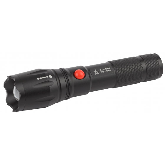ЭРА Армия России Калибр - универсальный светодиодный аккумуляторный фонарь с лучом повышенной дальности, пятикратным зумом и встроенным светонакопителем. Его легко найти в тмном помещении или в траве - после выключения он сохраняет лёгкое свечение.
