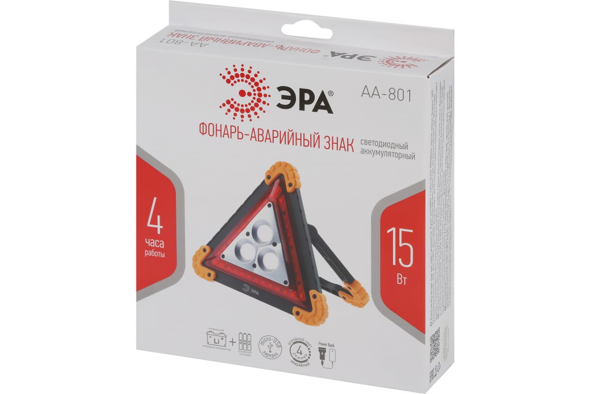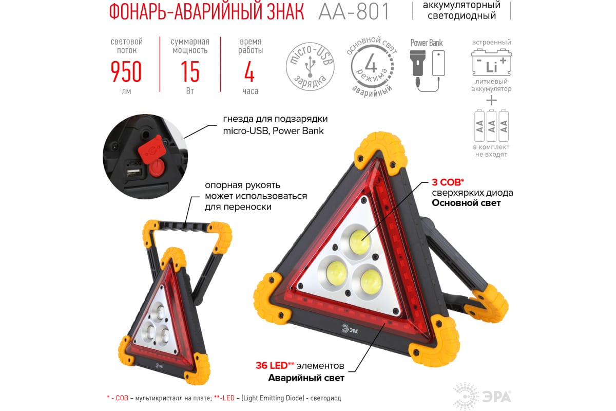 Аккумуляторный светодиодный автомобильный фонарь ЭРА AA-801 аварийный знак 15Вт power bank Б0052742 с яркими светодиодами последнего поколения. Имеет опцию аварийного знака. Может использоваться как power bank подзарядит ваш телефон в экстренной ситуации. Такой помощник должен быть в каждом автомобиле! В данном фонаре применены два типа светодиодов LED-элемент для формирования направленного светового луча и светодиоды COB ("мультикристалл на плате"). От одной подзарядки ЭРА AA-801 непрерывно светит в режиме прожектора 4 часа, в режиме аварийного знака 20 часов! Данный фонарь может работать как от аккумулятора, так и от пальчиковых батареек.