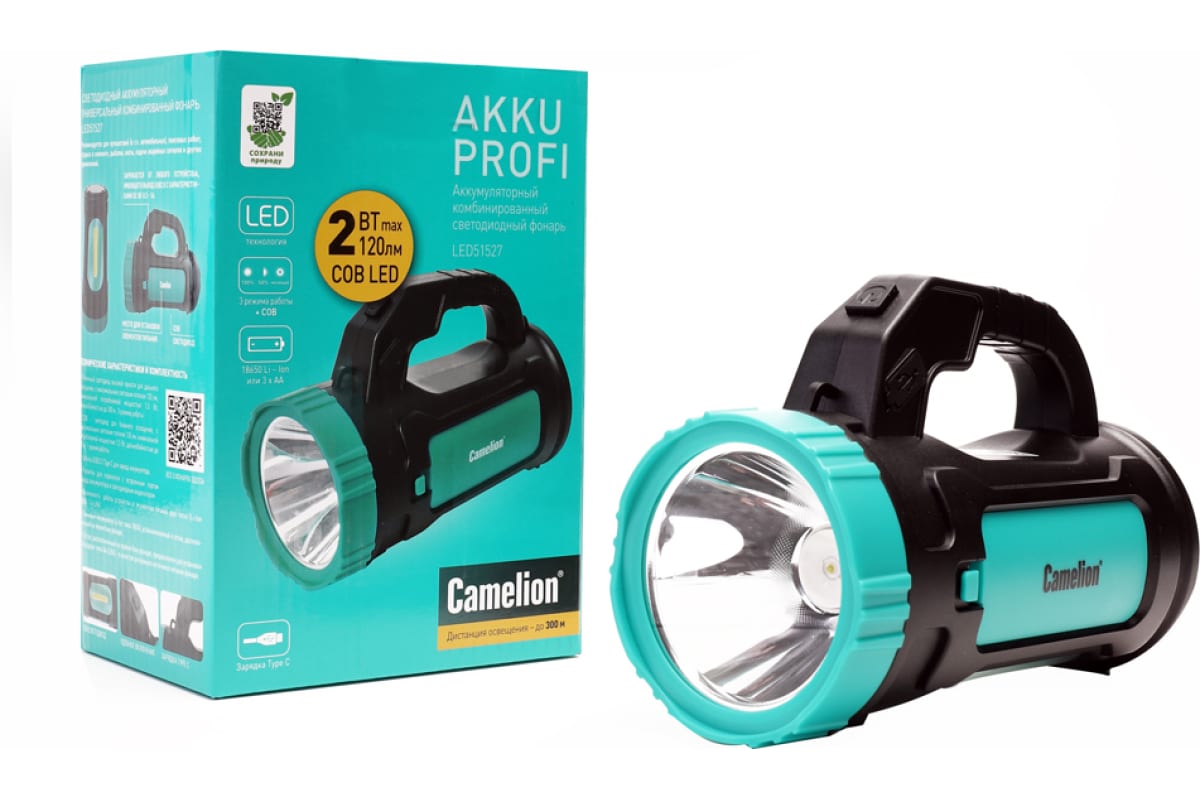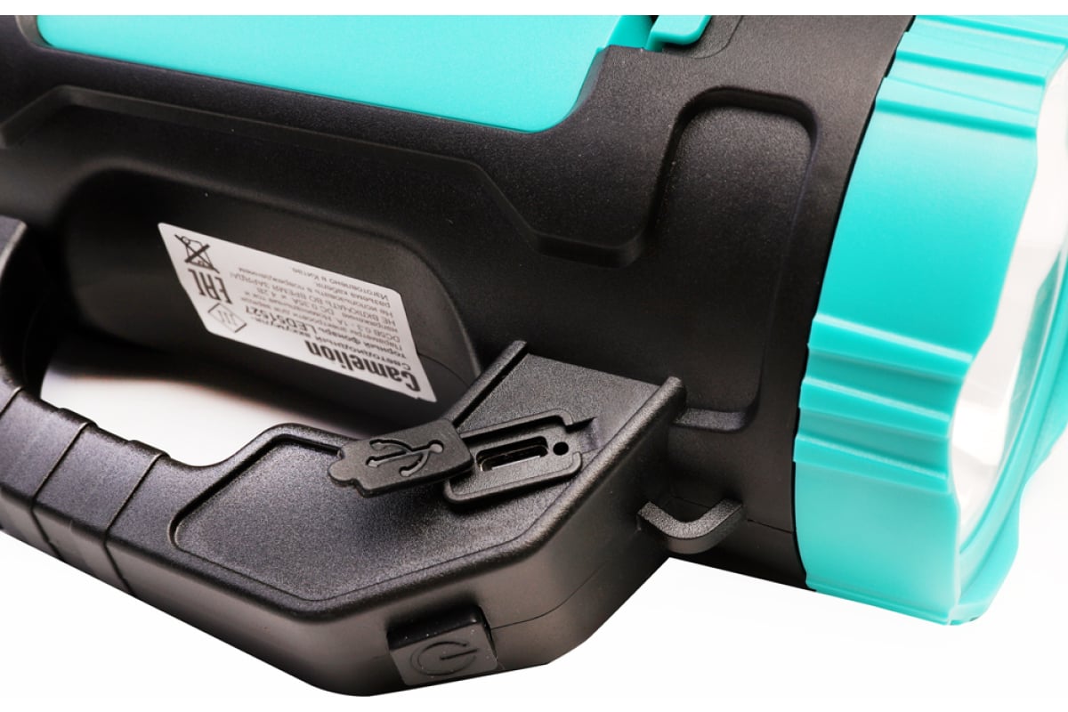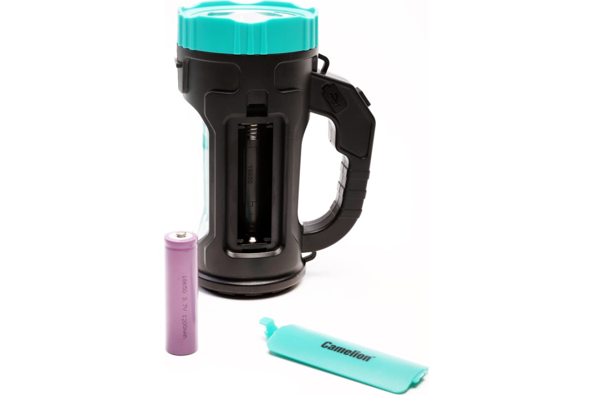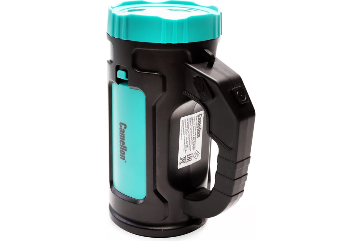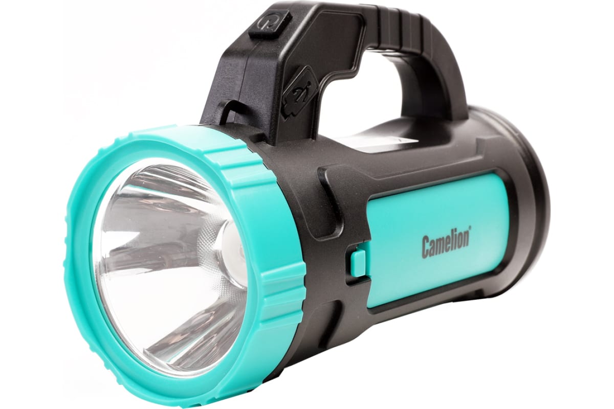 Лучевой фонарь - прожектор Camelion электрический светодиодный аккумуляторный. Цвет корпуса: черный с салатовым. Материал корпуса - пластик ABS.