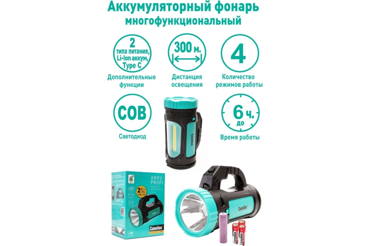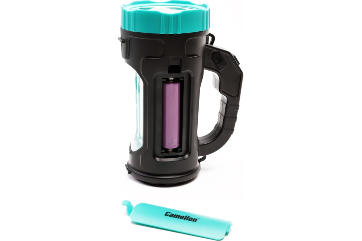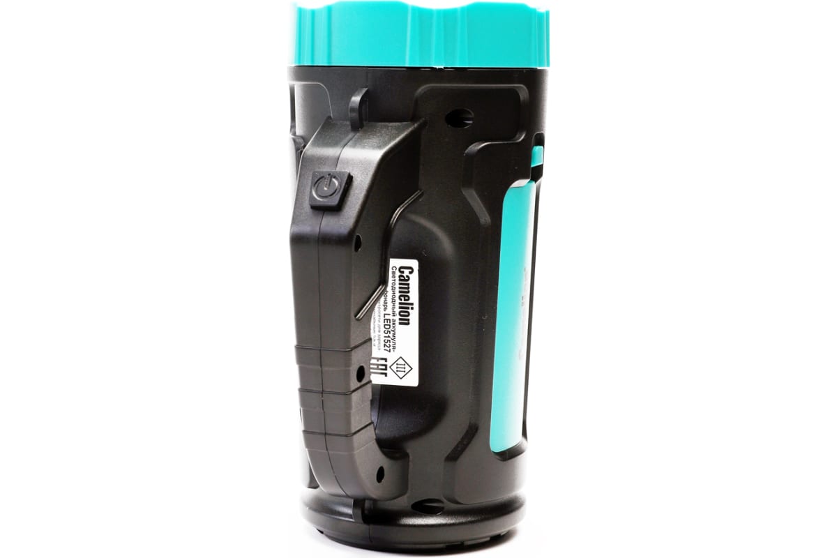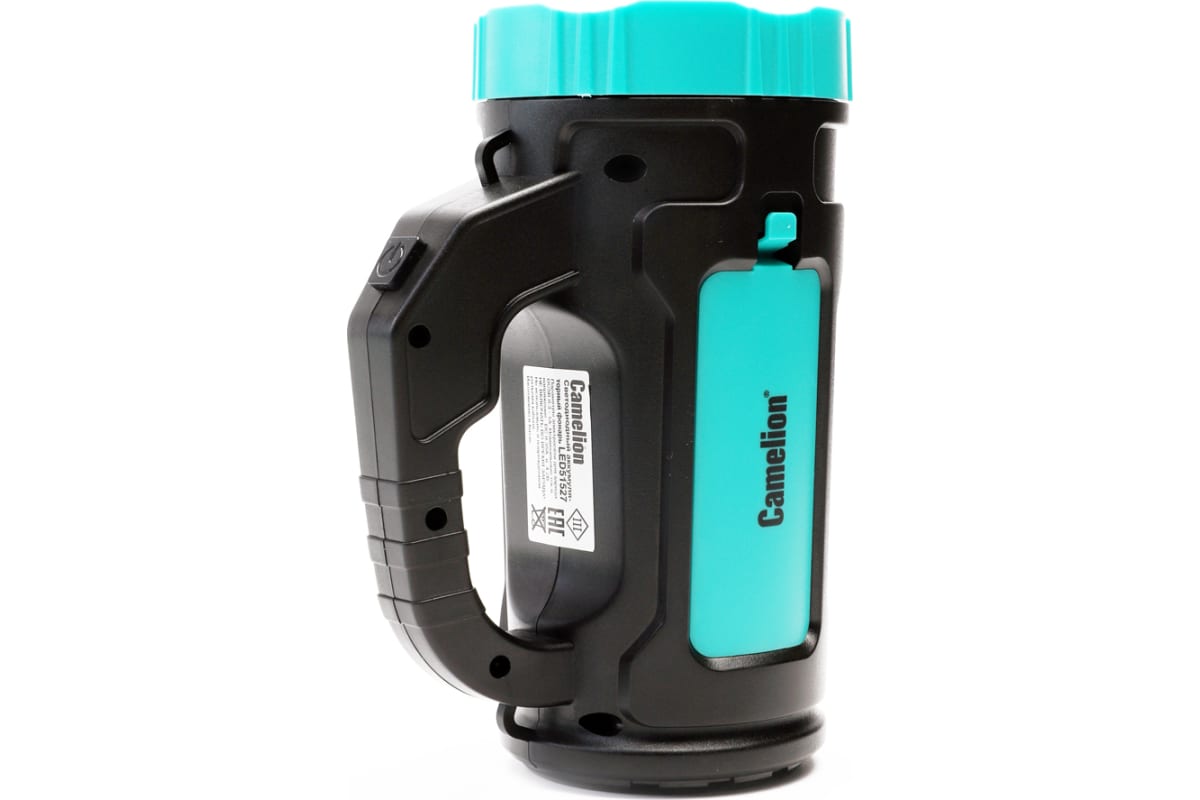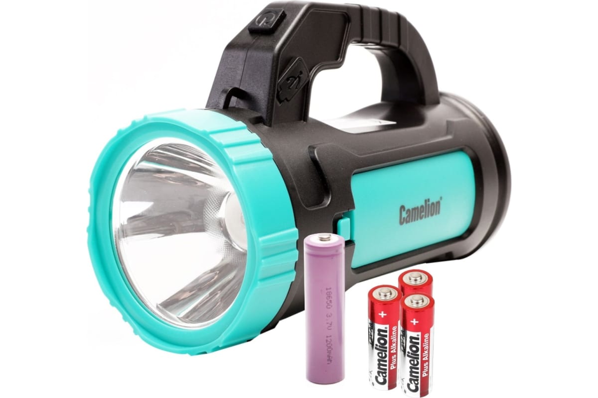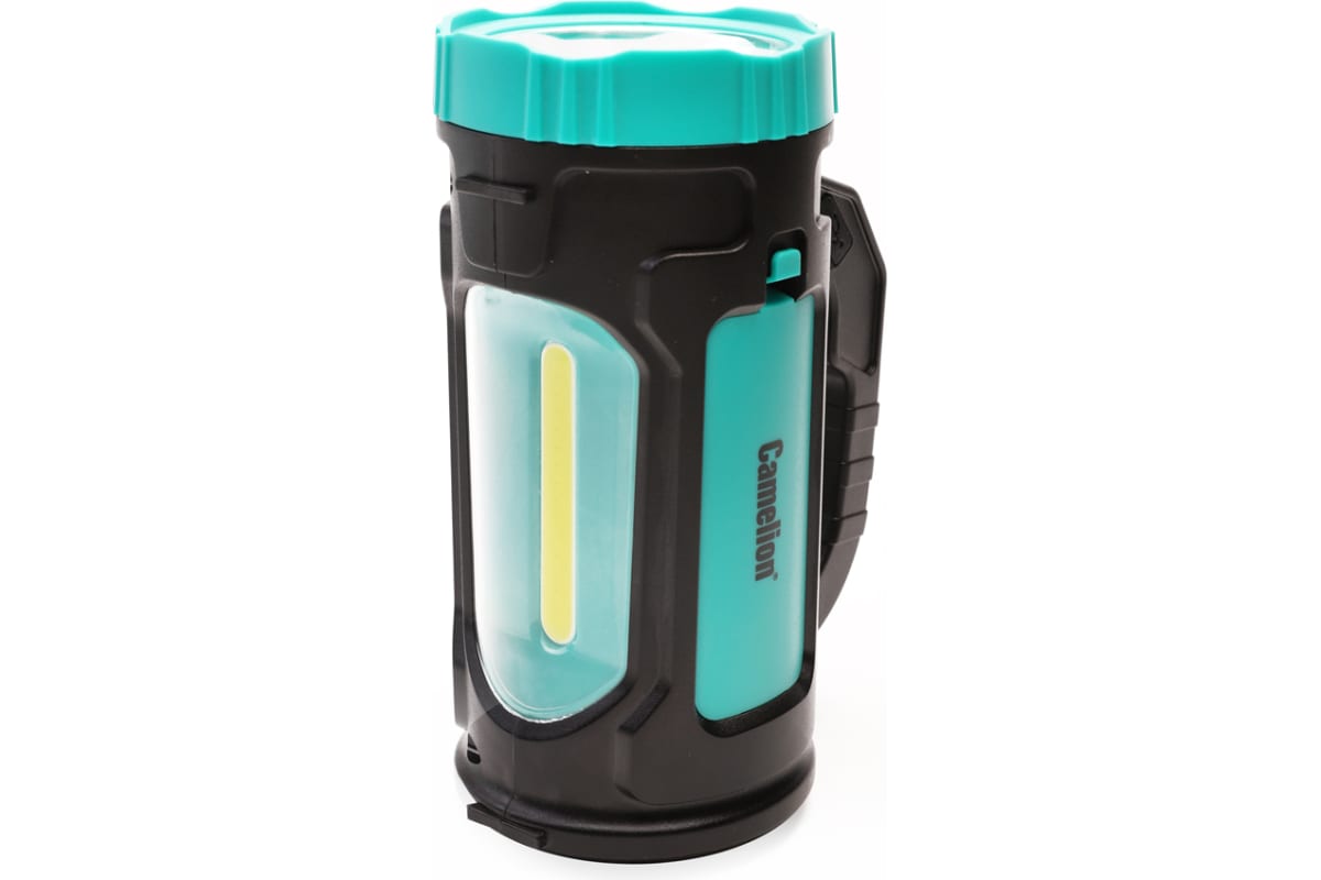Лучевой фонарь - прожектор Camelion электрический светодиодный аккумуляторный. Цвет корпуса: черный с салатовым. Материал корпуса - пластик ABS.