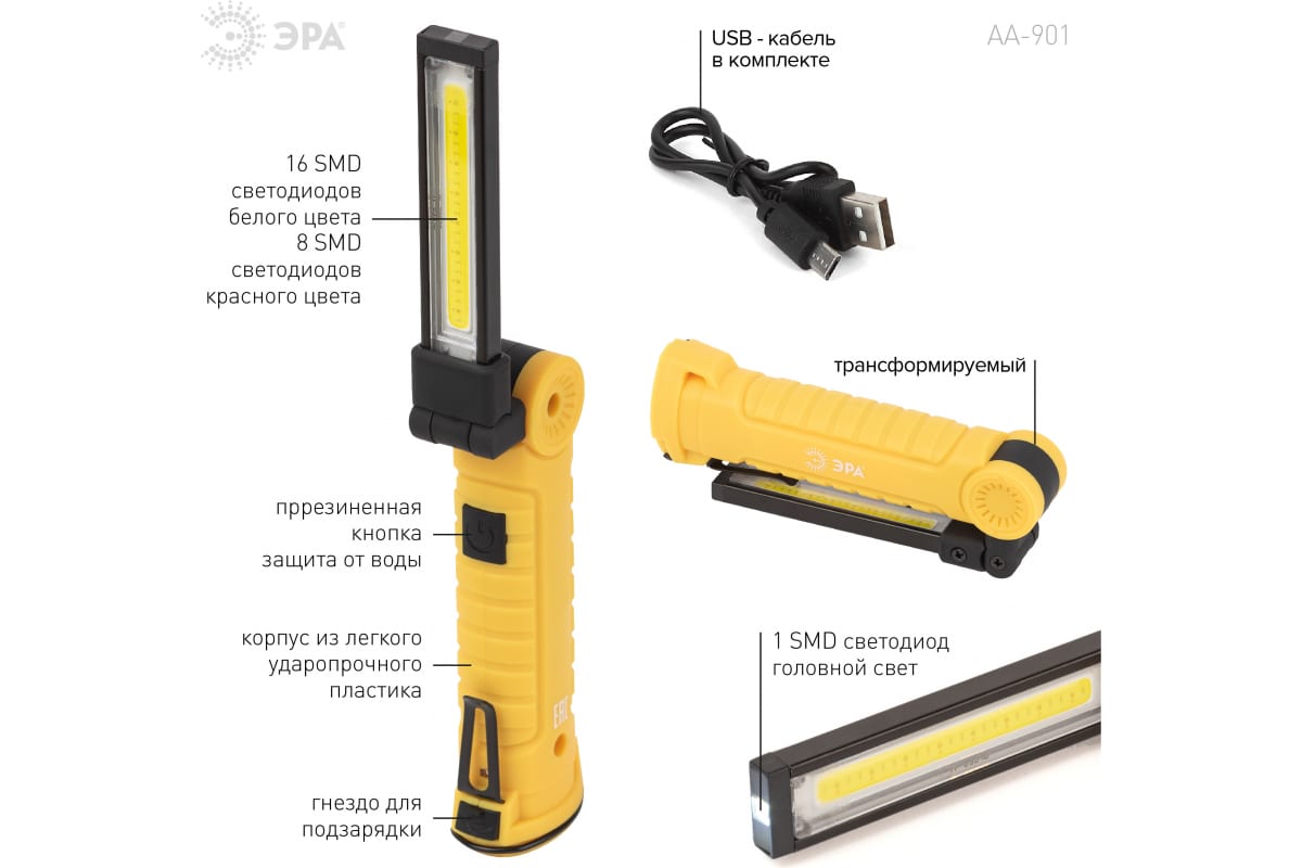 Технические характеристики ЭРА Практик AA-901 СОВ+LED 3Вт магнит, крючок, клипса Б0054041