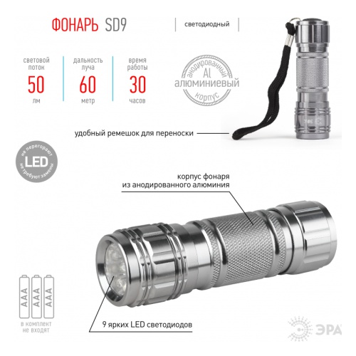 Алюминиевый фонарь ERA SD9. Не требуют замены на протяжении всего срока службы фонаря. 3 батарейки AAA обеспечивают до 30 часов работы.