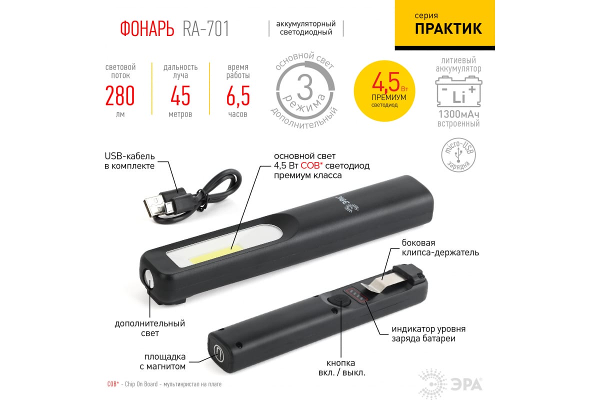 Фонарь ЭРА RA701 Практик ЗВт COB, 3Вт LED, магнит, клипса держатель Б0039623 - компактный аккумуляторный фонарь специальной серии ЭРА Практик, которая отличается сверхъяркой технологией "мультикристалл на плате" и набором удобных креплений.