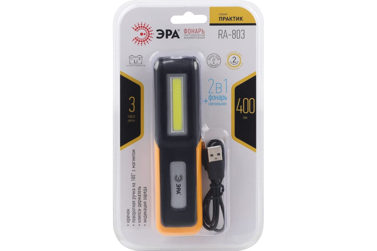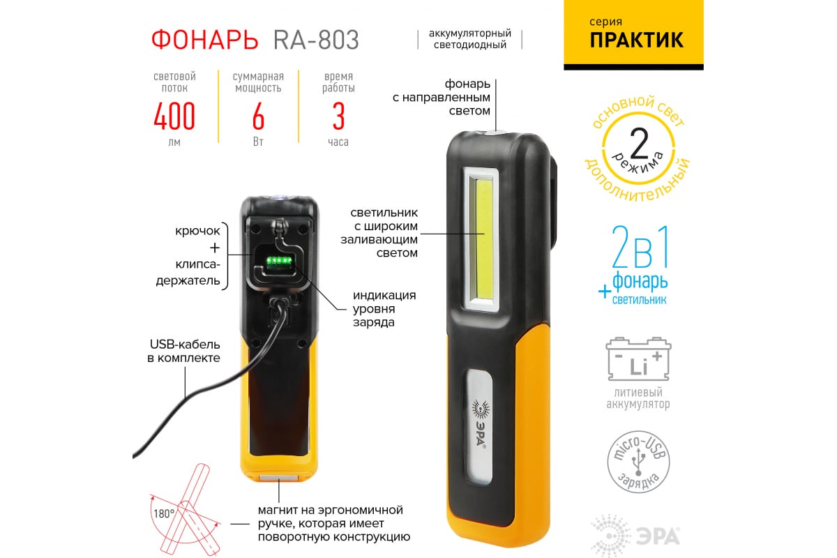 Дополнительные технические характеристики светодиодного фонаря ЭРА Рабочие, серия "Практик" RA-803 аккумуляторный, крючок, магнит Б0052313: