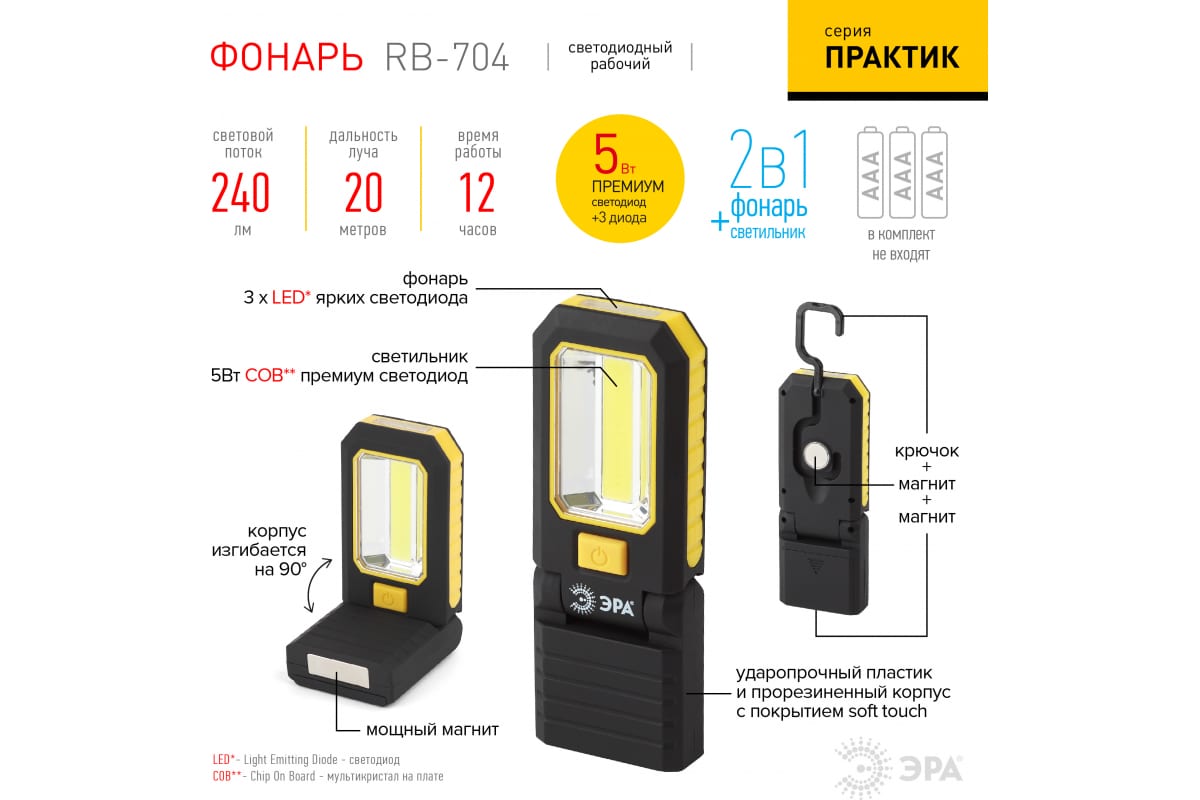 Технические характеристики ЭРА RB-704 Практик 5Вт COB 3xLED пластик, 3xAAA, крючок, 2 магнита Б0029179