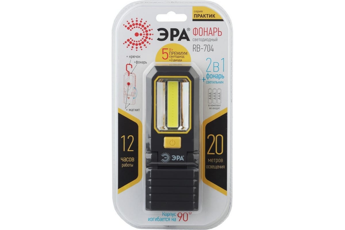 Кемпинговый светодиодный фонарь ЭРА RB-704 Практик 5Вт COB 3xLED 3xAAA крючок 2 магнита Б0029179 - многофункциональный светодиодный фонарь с режимом светильника и двумя типами крепления. Корпус сгибается в двух направлениях (по 90 градусов каждое). На торце - мощный магнит. Дополнительный магнит расположен на задней стороне фонаря. Имеется удобный прочный крючок. Закрепив фонарь на нужной поверхности, можно быстро настроить необходимый для работы угол освещения. Переключение режима превращает фонарь в светильник с ближним заливающим светом. Фонарь незаменим как при профессиональных работах (строительство, ремонт, монтаж, обслуживание), так и в частном использовании (работы в доме, на приусадебном участке, путешествия). Покрытие корпуса - софт-тач (мягкое, приятное на ощупь, без скольжения). Основной режим освещения - яркая LED-плата СОВ (5 Вт). Сопутствующий - 3 диода на торце с направленным лучом длиной до 20 метров. Сверхмощные светодиоды COB ("chip on board" - "кристалл на плате") ранее применяли исключительно в промышленном освещении, сейчас технологию удалось адаптировать под универсальные цели. Получился яркий и при этом мягкий ровный свет. Одного комплекта батареек (3 мизинчиковые) хватит на 12 часов непрерывной работы.