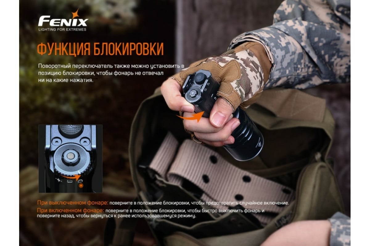 Запатентованный переключатель для выбора тактических и туристических режимов, а также для блокировки фонаря.