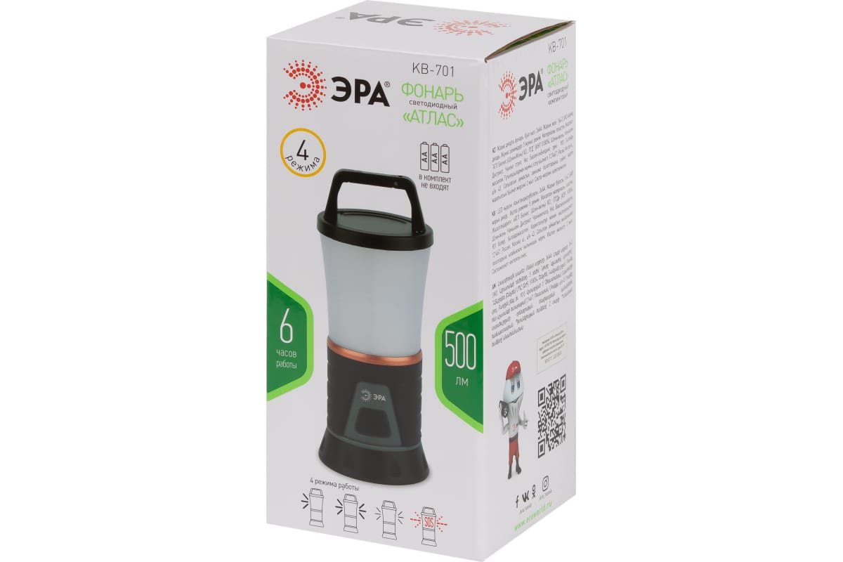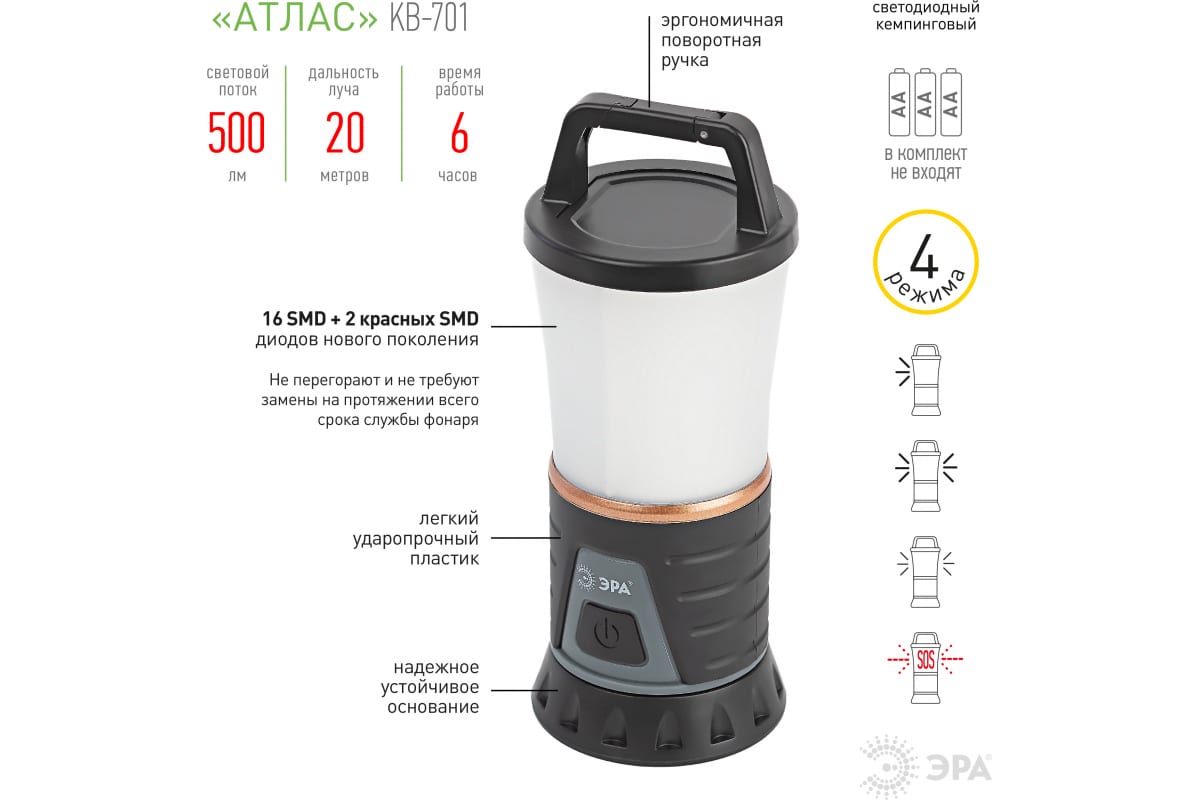 1.Кемпинговый светодиодный фонарь ЭРА KB-701 Атлас на батарейках 10Вт, 3хАА, Б0054036 выполнен из легкого ударопрочного пластика.
