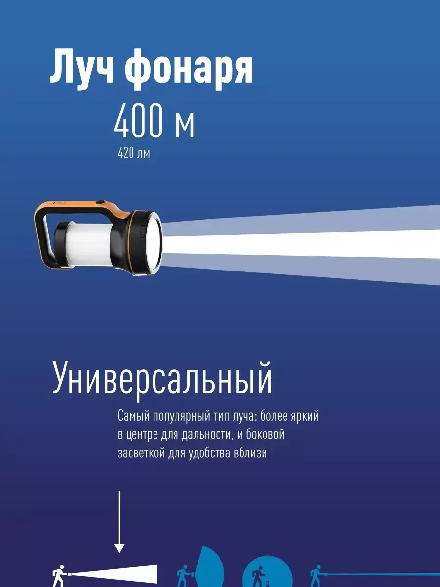 Ручной фонарь Космос KOSAccu2007W 2-в-1 со встроенным светильником на 360 градусов. Матовый рассеиватель дает мягкий, рассеянный свет, приятный для глаз. Совмещает луч фонаря (светит как фара автомобиля, направленный свет с ярким пятном засветки в центре) и свет кемпинговой лампы (освещает пространство вокруг себя). Длина луча – 400 м, время беспрерывной работы – до 5 ч в режиме основного света, до 18 в режиме эконом. Площадь освещения светильника - 42 кв.м, время беспрерывной работы – до 4 ч. 3 режима работы – яркий и экономичный для луча и режим кемпинговой лампы. Современный литиевый аккумулятор 3,7В 4800 мАч, подзарядка от USB. Упакован в коробку с подробной информацией о модели и схемой фонаря.