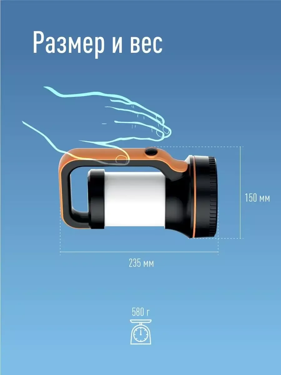 Двойное назначение фонаря — прожектор и кемпинговый светильник с литиевым аккумулятором.