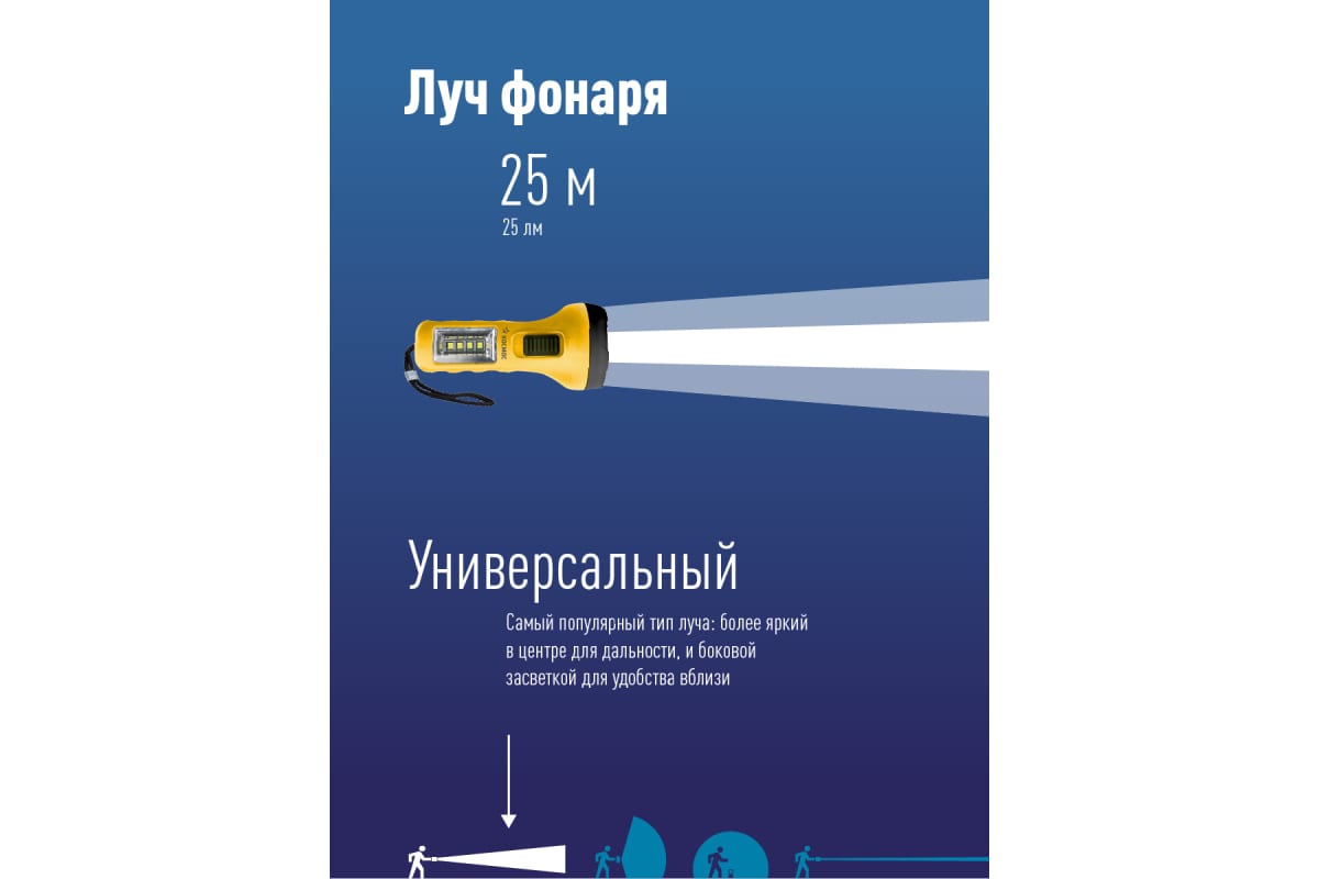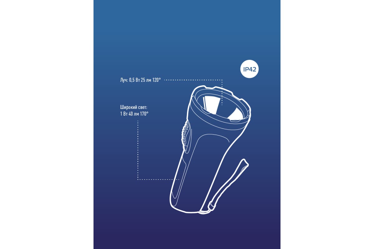 Источник света: 1LED (0,5Вт); боковой светильник 4SMD LED(1Вт). Количество режимов: 2 (луч-боковой светильник). Световой поток: 25 лм. (луч)/40 лм. (широкий свет, боковой светильник).