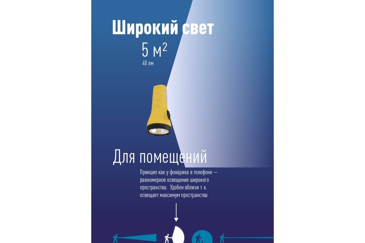 Совмещает луч фонаря (направленный свет) и широкий свет (освещает широкое пространство с одной стороны).