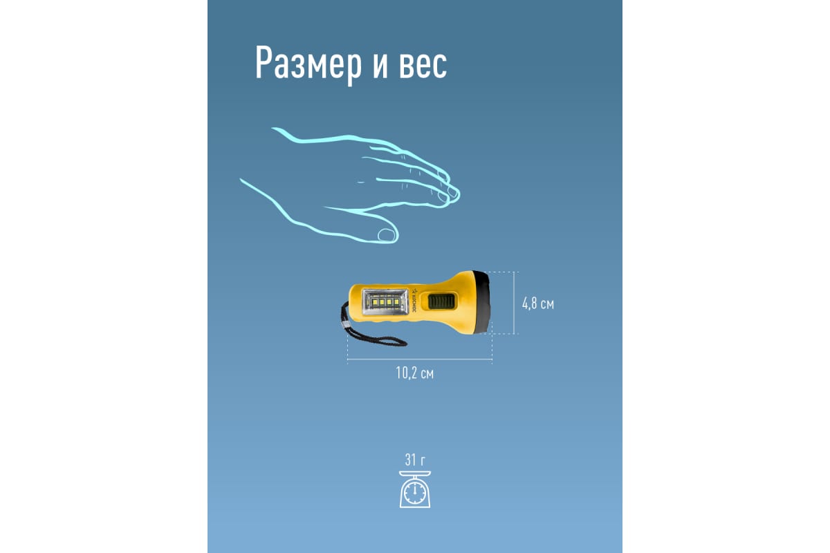Ручной фонарь КОСМОС 0,5Вт LED+4SMD(1Вт)/1xAA/корпус ABS-пластик/ремешок ручной, KOC119B 2в1 без лишних функций, ценовой лидер в ярком желтом цвете. Источник питания: 1xAA (в комплект не входит).