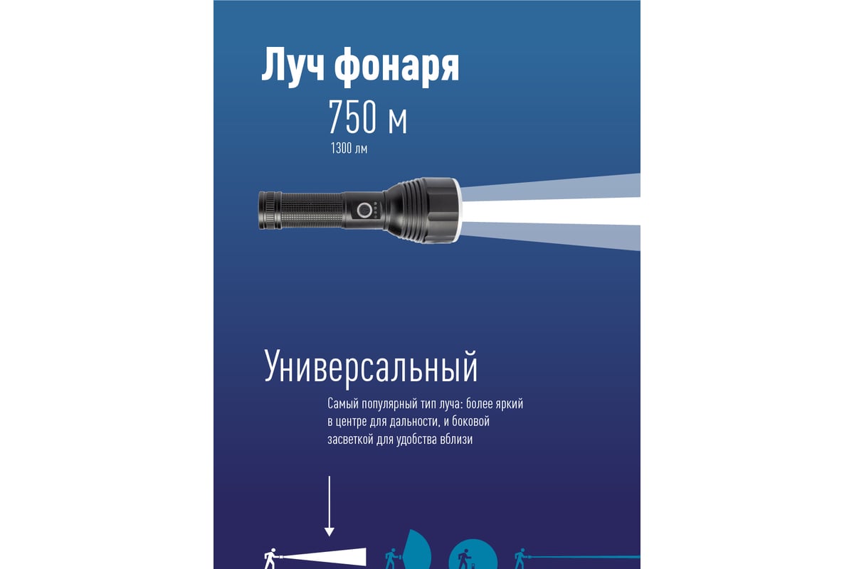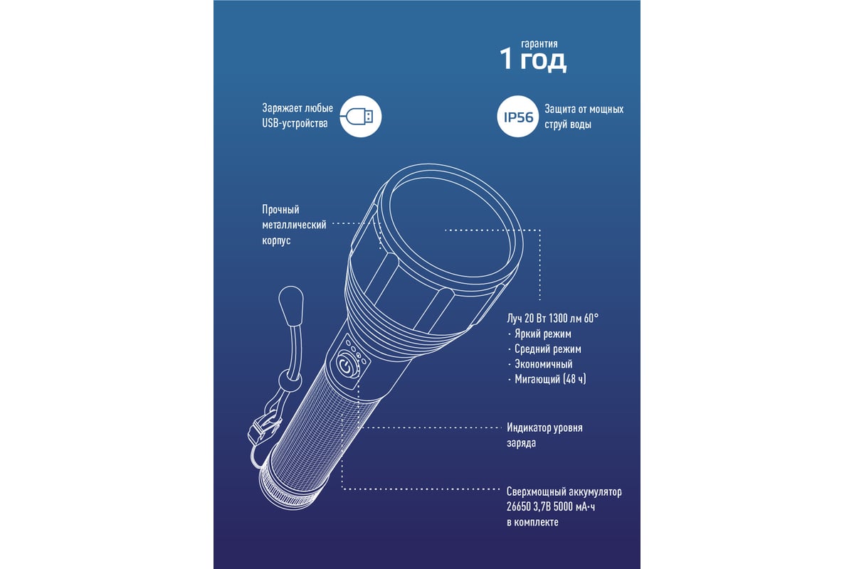 Фонарь ручной КОСМОС (KOC130Lit) - модель такого уровня впервые в линейке Космос: луч мощностью 20 Ватт — это 1300 люмен, что сопоставимо с мощностью сразу 3–4 прожекторных фонарей! В качестве питания установлен сменный сверхмощный литиевый аккумулятор 26650 на 5000 мА/ч. Полностью металлический корпус защищён от дождя и имеет умный индикатор, отображающий уровень заряда в процессе использования. А powerbank-выход зарядит мобильные устройства.