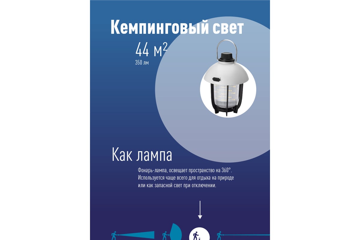 -Дистанция освещения: 44 м2 (круговой кемпинговый свет).