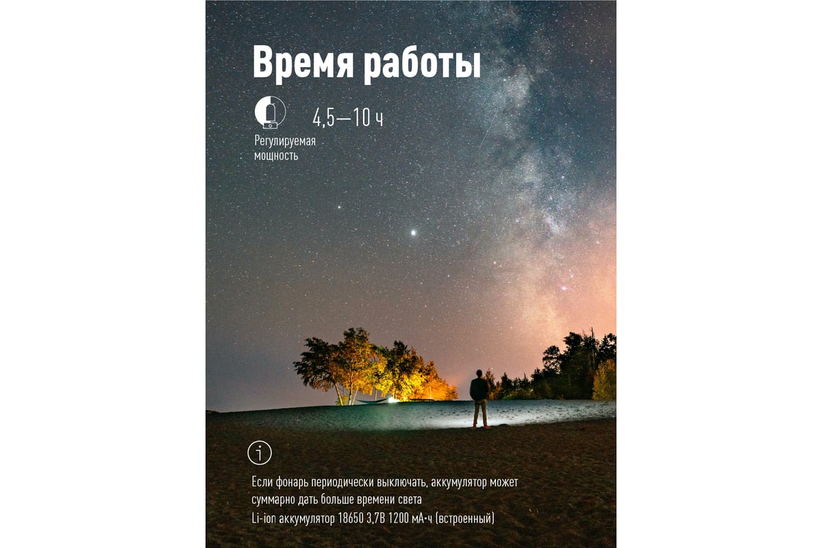 -Источник питания: Li-ion аккумулятор 18650 3,7В 1200 мА/ч (встроенный), зарядный USB-шнур в комплекте.