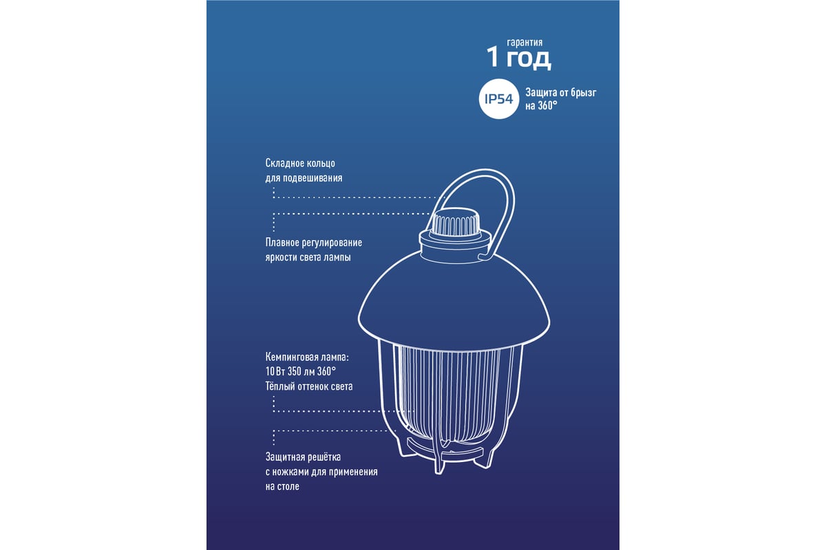-Источник света: кемпинговая лампа 10Вт SMD LED (теплый свет); диммирование.