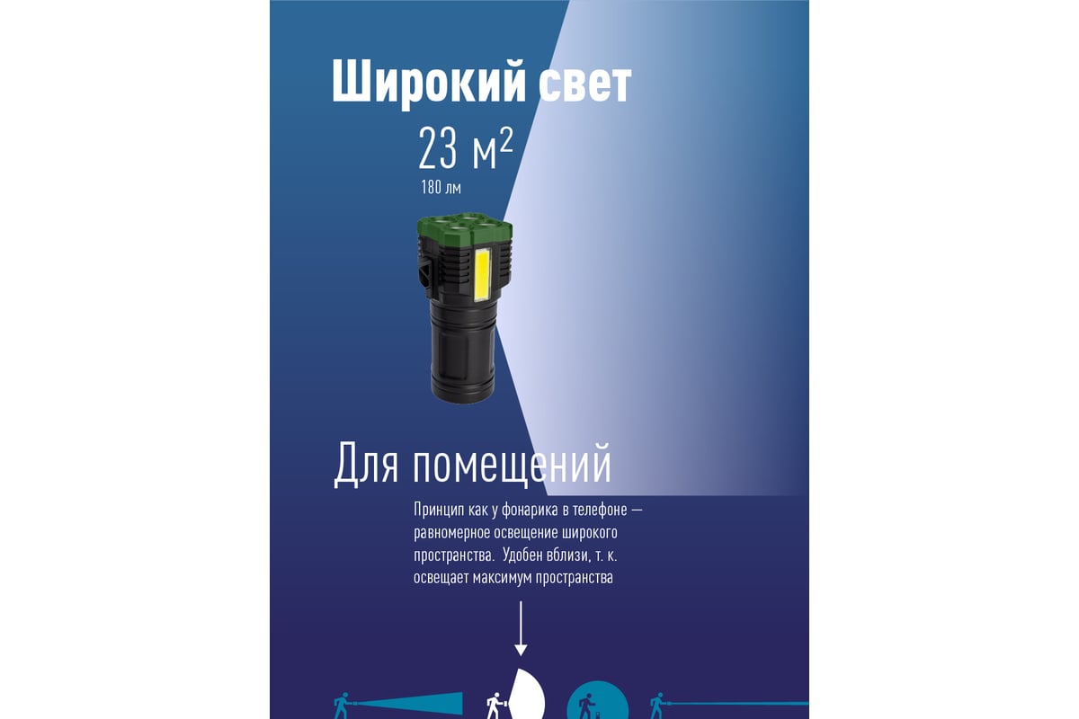 -Дистанция освещения: 125 м. (луч)/23 м2 (широкий свет, боковой светильник).