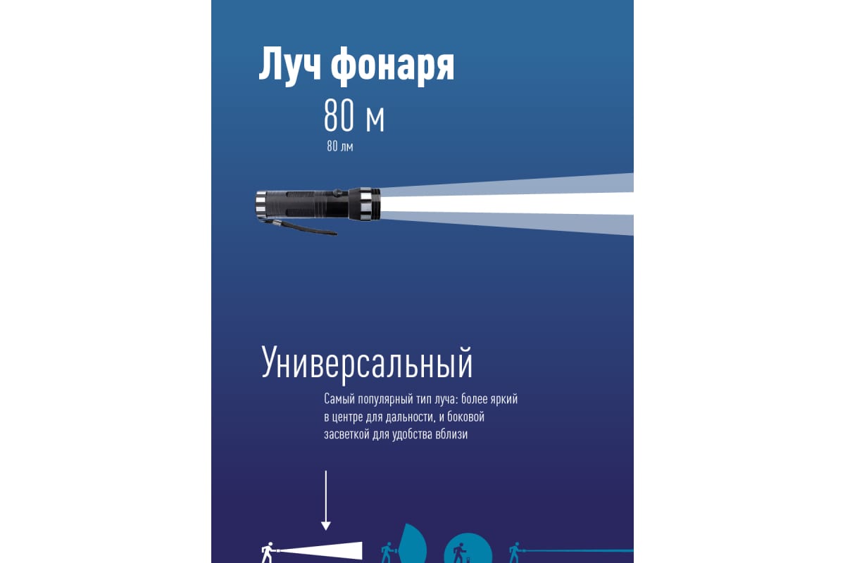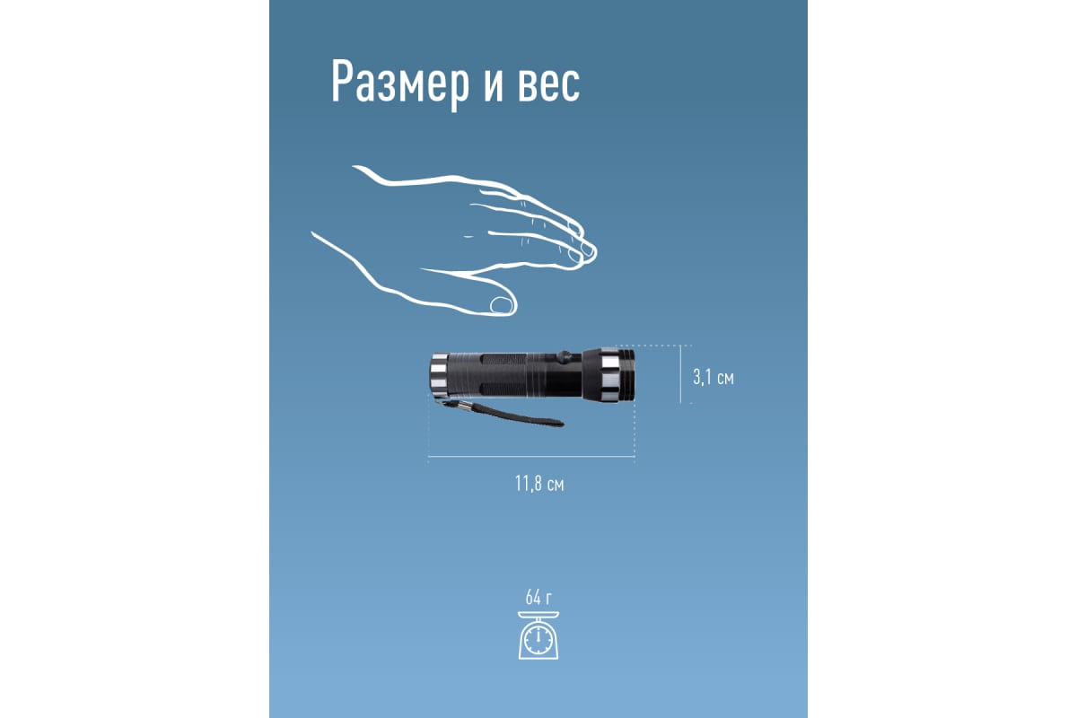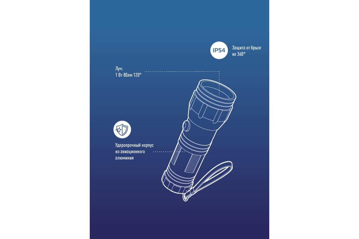 Луч фонаря светит вперед, направленный свет. Источник света: 1 Вт LED. Количество режимов: 1 (яркий).