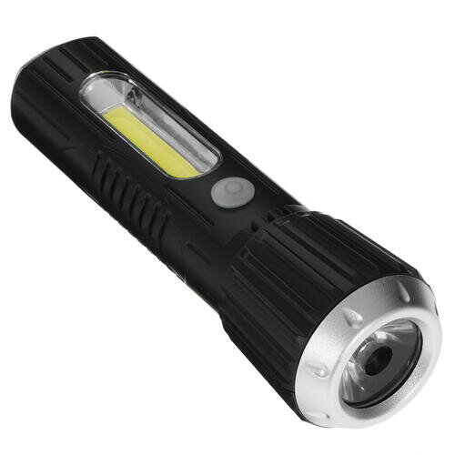 Ручной аккумуляторный фонарь КОСМОС 1Вт LED+2Вт COB, коллиматорная линза, Li-ion 18650 1000mAh, ABS-пластик, USB шнур KOS114Lit с защитой от дождя. Совмещает луч фонаря (направленный свет) и широкий свет (освещает широкое пространство с одной стороны). Источник питания: Li-ion аккумулятор 18650 3,7В 1000 мА/ч (встроенный).