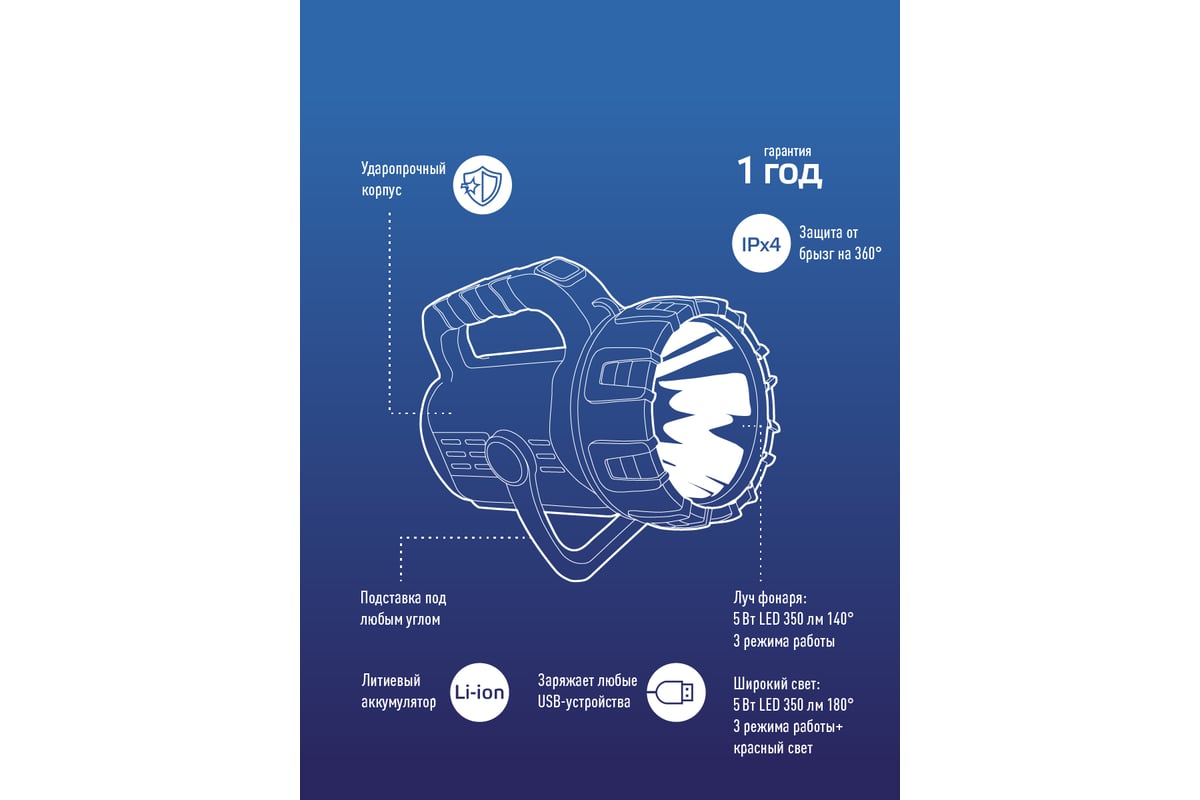 Фонарь КОСМОС Premium 5Вт направленный свет, 5Вт СОВ, литий 3600mAh, MICRO USB шнур в комплекте KOSAc8010WLith имеет умный индикатор зарядки покажет, сколько именно энергии осталось. Удобный переключатель: несмотря на 7 режимов света, фонарь легко включить и выключить длительным нажатием. Функция powerbank: подзарядка мобильных устройств. Подставка с регулируемым углом. Заряд фонаря от USB позволит использовать подзарядку даже в автомобиле или на природе от powerbank.
