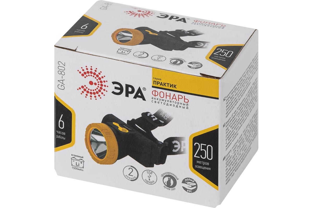 Технические характеристики ЭРА GA802 светодиодный аккумуляторный мощный яркий 2 режима желточерный Б0055349