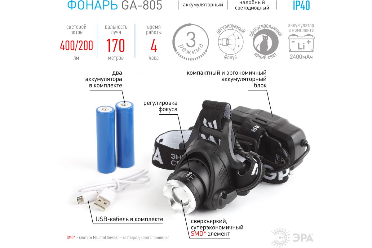 Налобный фонарь ЭРА GA805 аккумуляторный, регулируемый фокус, 5 Вт, CREE Б0039625 с яркими экономичными светодиодами CREE мощностью 5 Вт. Фокус фонаря можно изменять, выбирая между дальним направленным лучом и ближним широким светом. В комплекте мягкий эластичный ремешок с брендированием и возможностью регулировки размера. Корпус фонаря изготовлен из ударопрочного пластика, устойчивого к механическим повреждениям, царапинам, сколам. Устройство прослужит долго и сохранит свой презентабельный вид. Фонарь выполнен в базовом черном цвете с матовым покрытием, линза обрамлена эффектным кольцом стального оттенка. ЭРА GA-805 компактен и удобен в использовании не требует батареек, подзаряжается от USB.