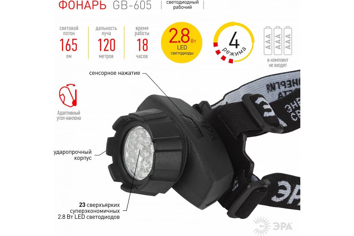 Преимущества ЭРА GB-605 23xLED, 3xAAA, 4 реж., черный, бл Б0031385