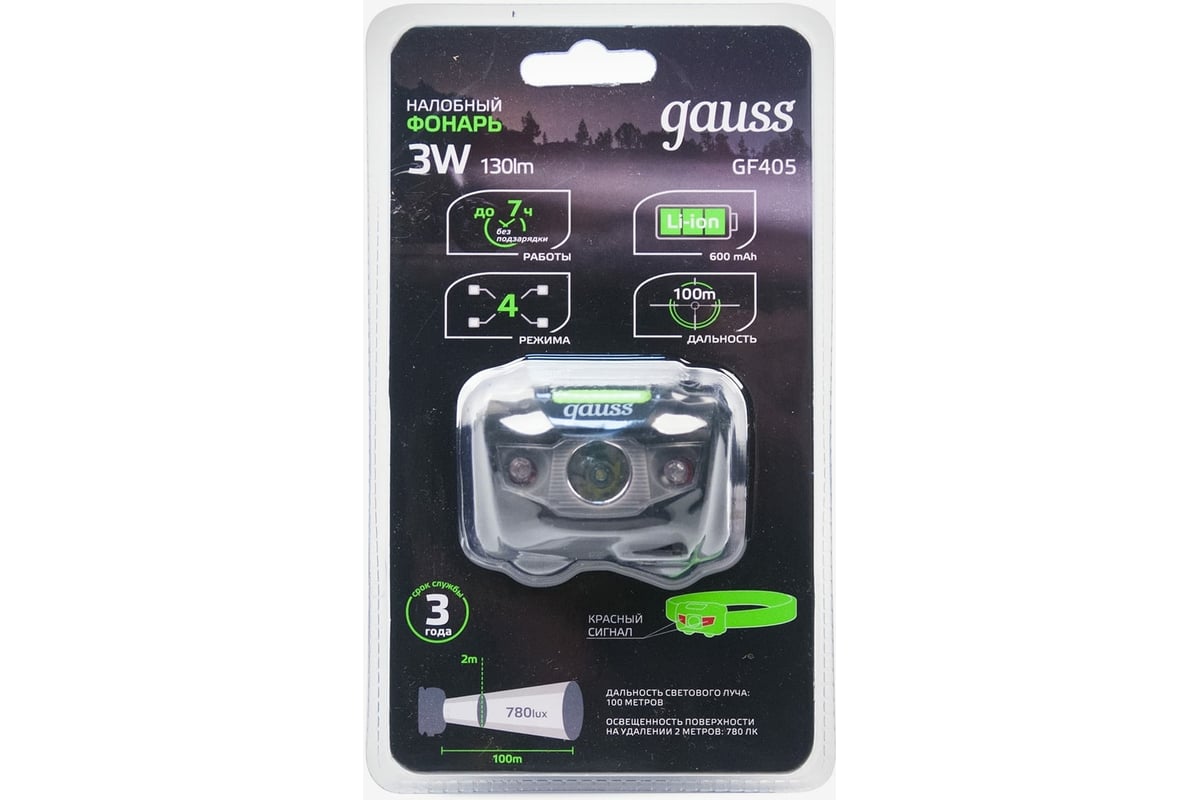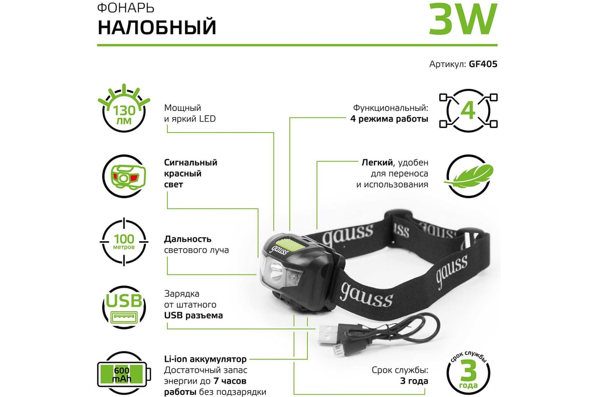 Фонарь налобный Gauss модель GFL405 3W 130lm Li-ion 600mAh LED - это многофункциональный фонарь с красным сигналом тревоги. Этот надежный и практичный фонарь станет незаменимым помощником в любых условиях.